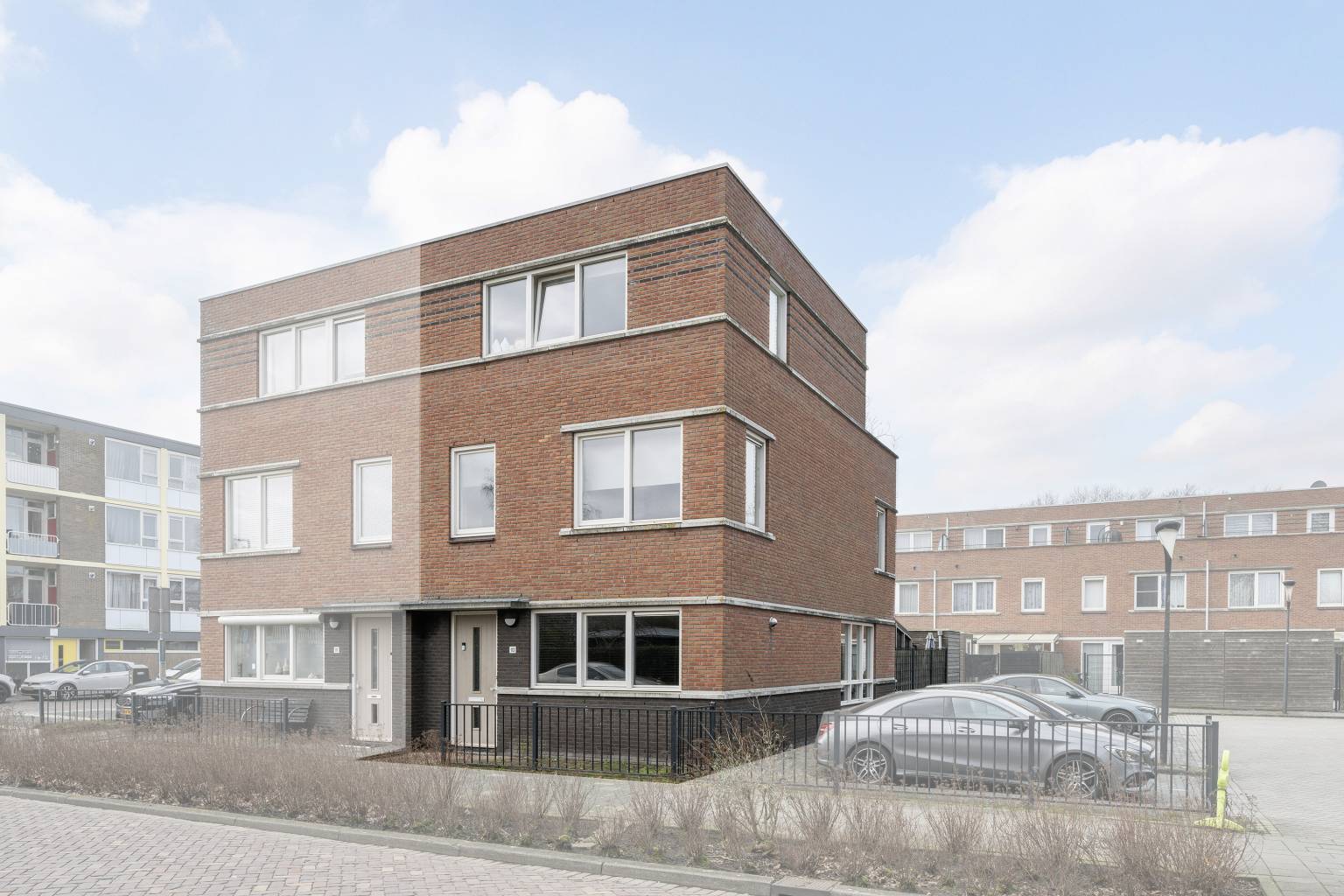 De volledig bestraatte voortuin met een metalen hekwerk is vrij toegankelijk vanaf de straat en geeft toegang tot de overkapte voordeur.