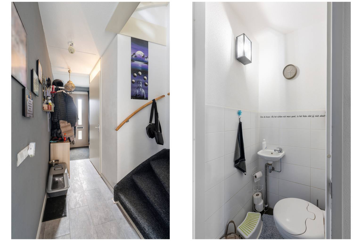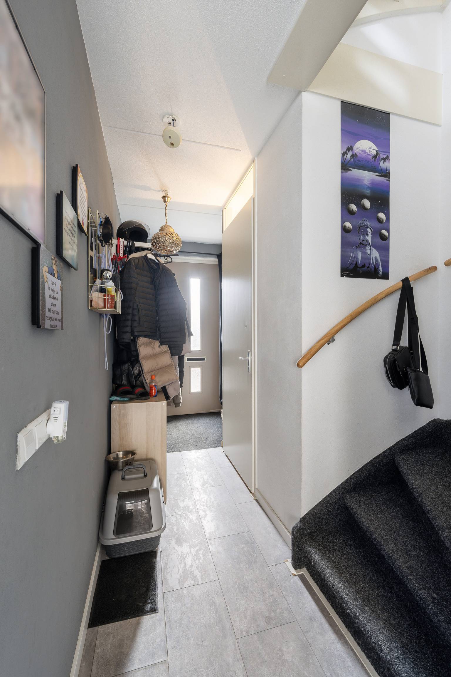 Na de voordeur is er een binnenkomst in de entreehal. Hier bevindt zich een vaste kast, met daarin de meterkast en vanuit hier is er toegang tot de trap naar de 1e verdieping, de woonkamer en het gedeeltelijk betegelde toilet. Alle wanden zijn afgewerkt met spachtelputz en er ligt een laminaatvloer, die is doorgetrokken naar de woonkamer.