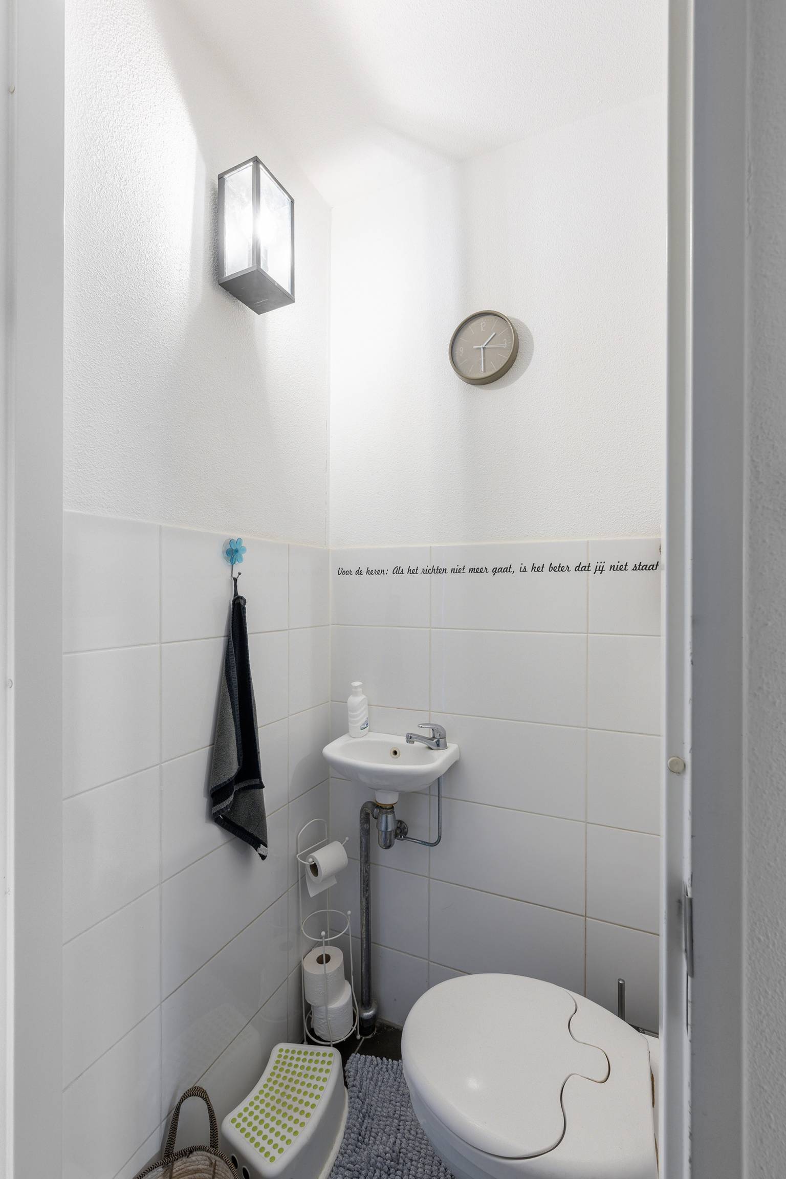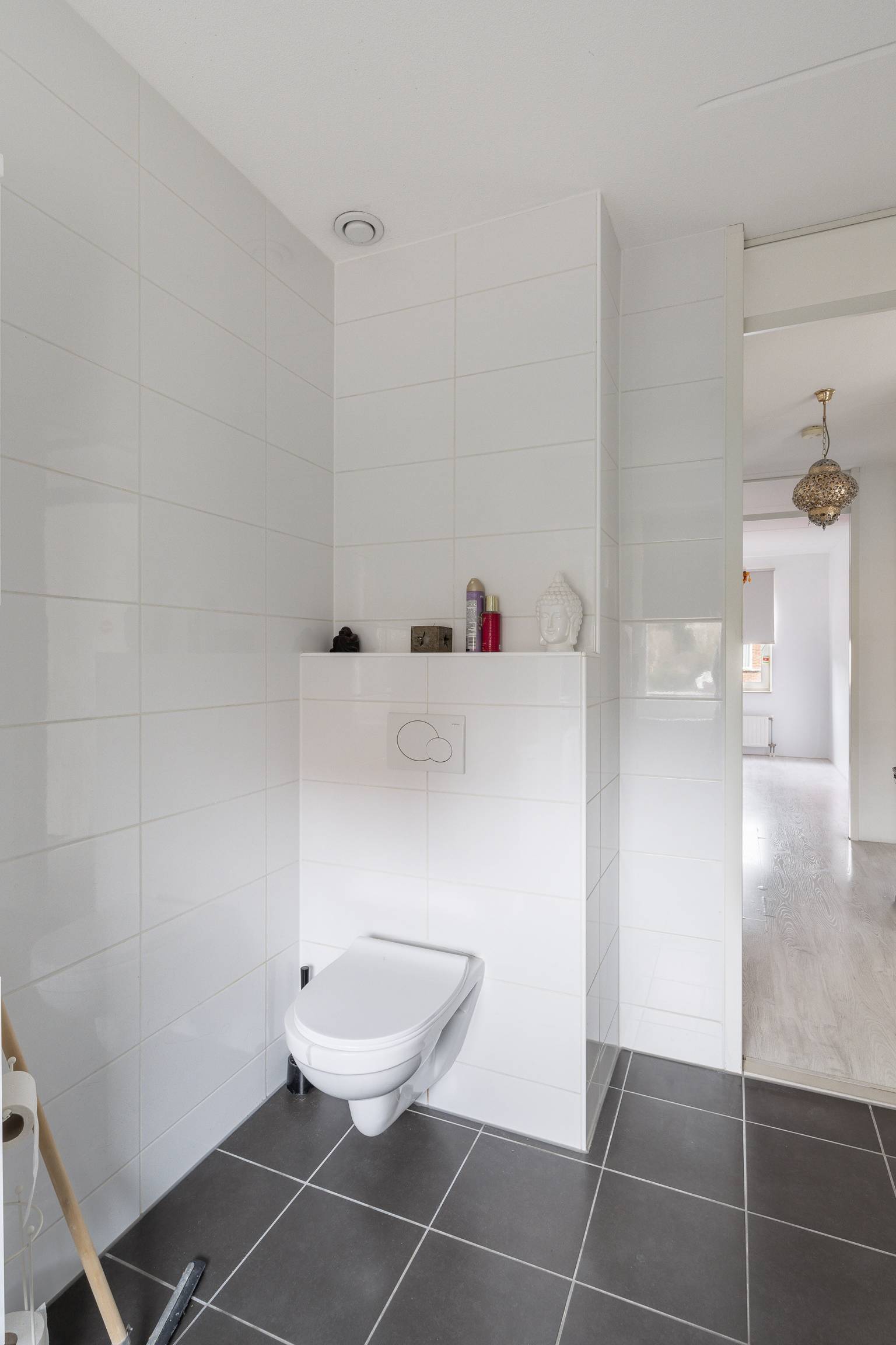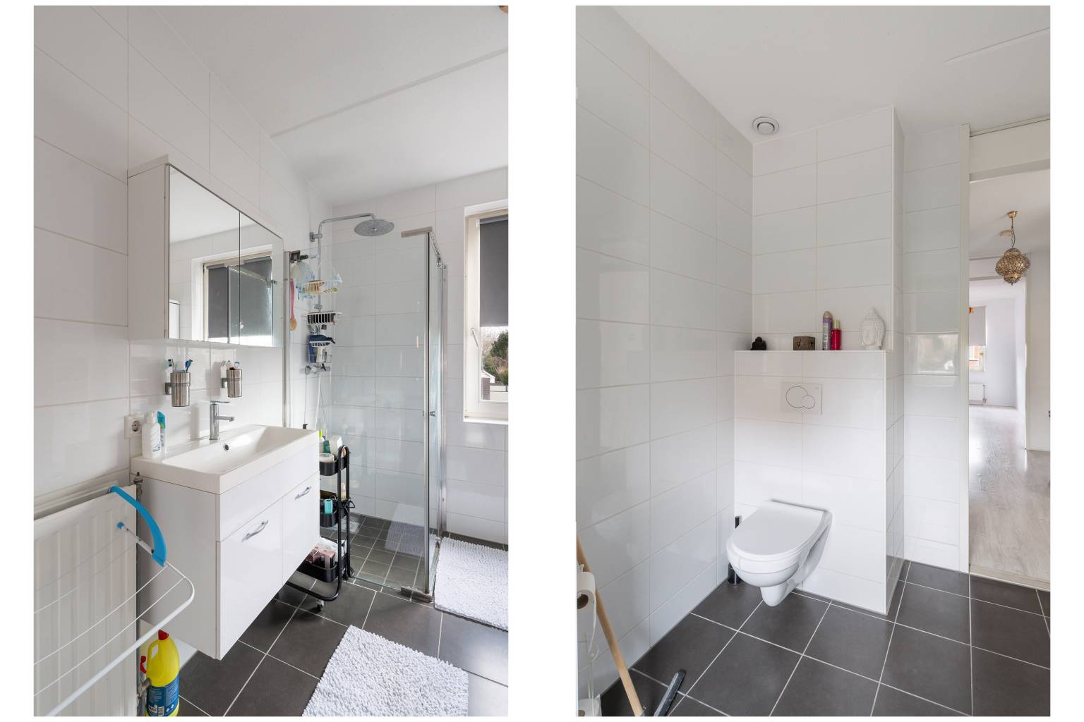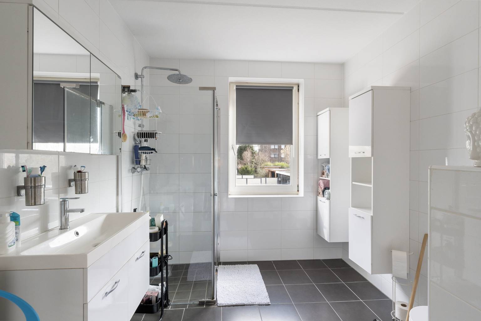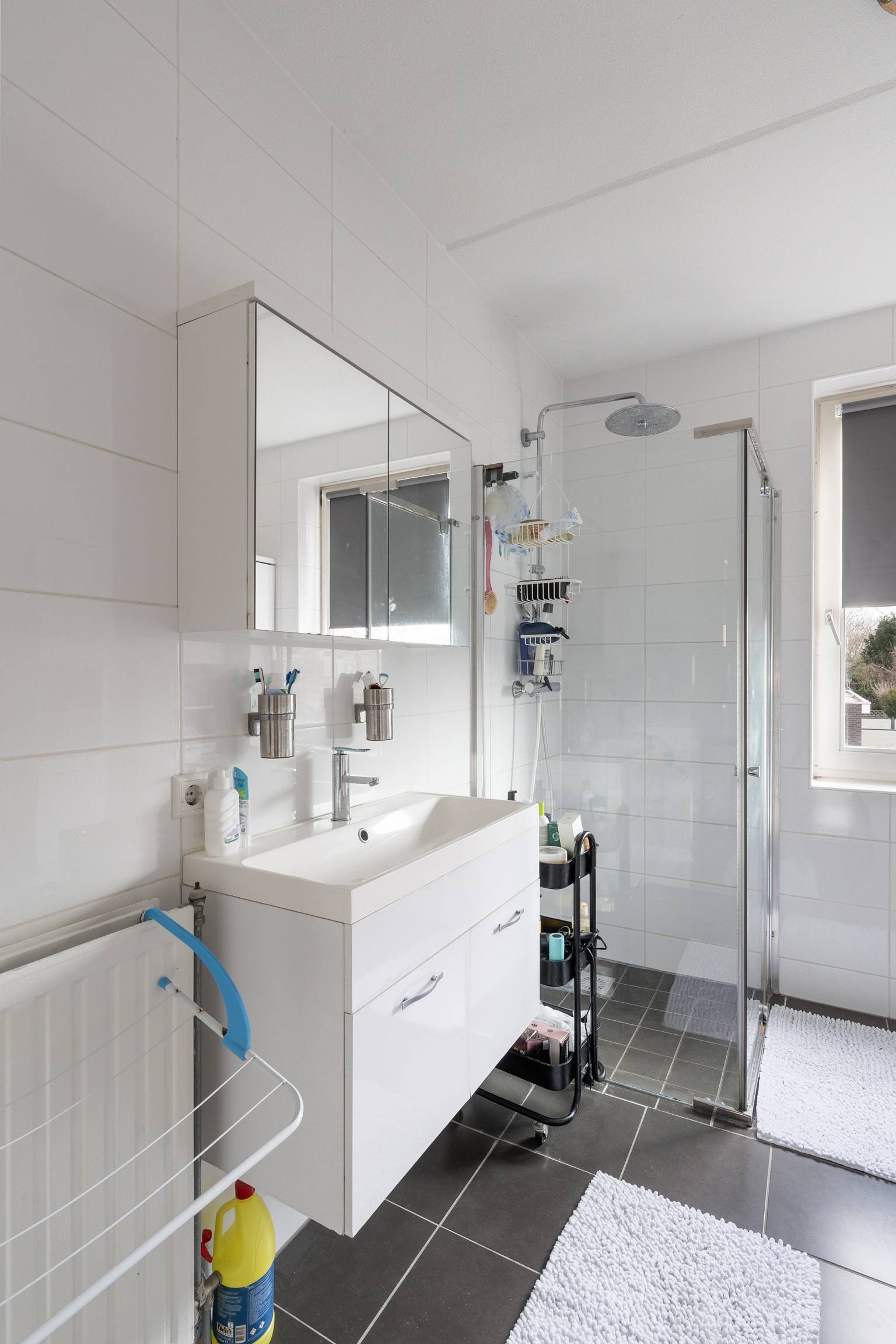 De volledig betegelde badkamer is uitgerust met een inloopdouche, een toilet en een wastafelmeubel met daarboven een spiegelkast. Er hangen twee aparte hoge kasten en er is een te openen raam aanwezig.