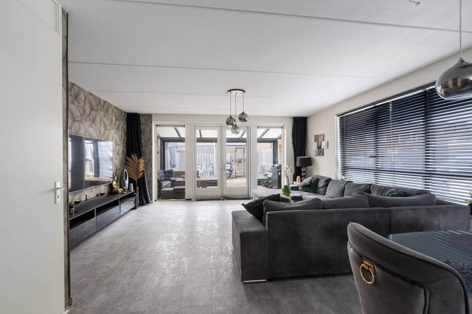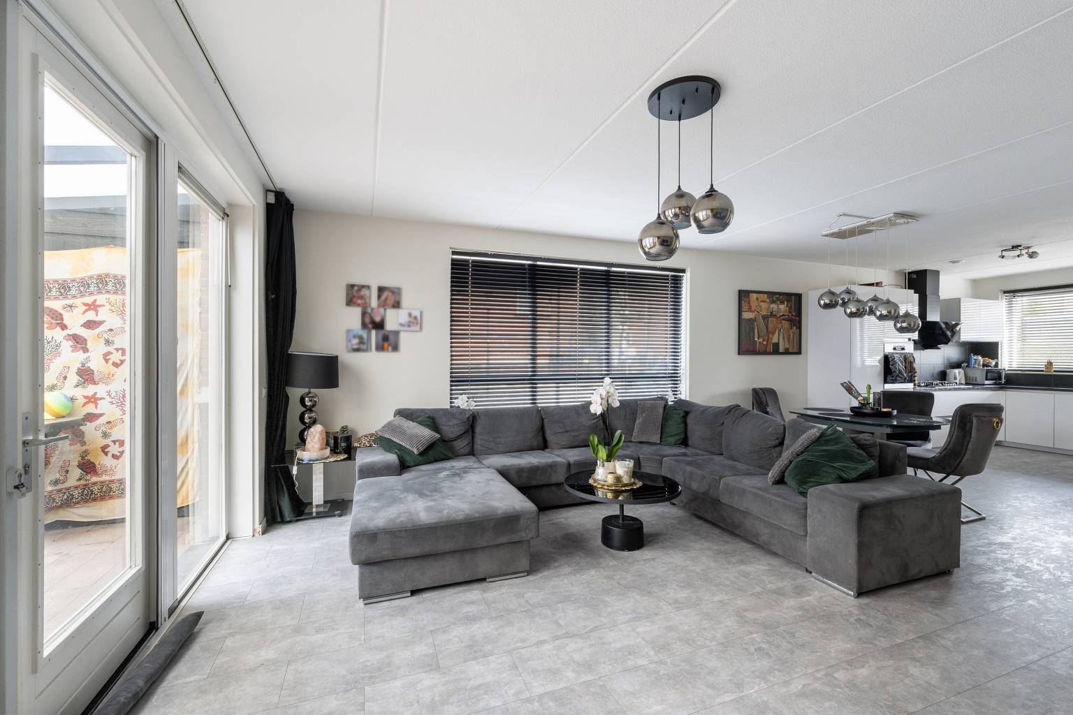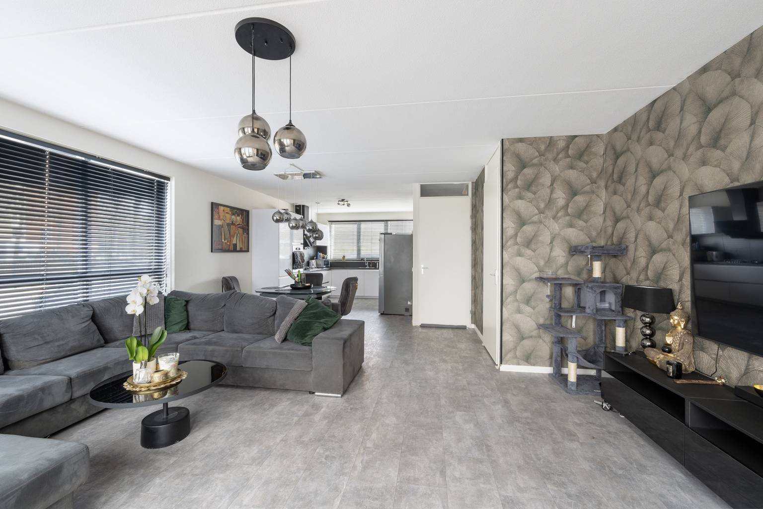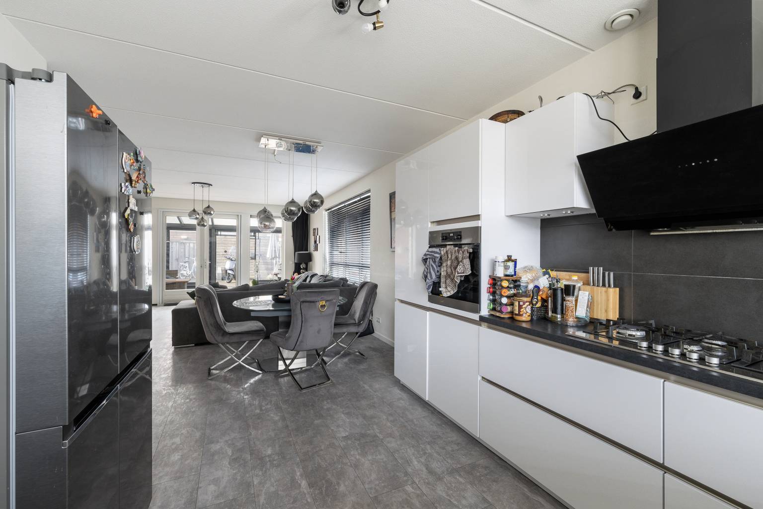 De woonkamer, met vloerverwarming, is gesitueerd aan de achterzijde en beschikt over openslaande deuren naar de achtertuin. Het grote zijraam zorgt voor extra daglicht en de wanden zijn afwisselend afgewerkt met behang en spachtelputz. Er is ruimte voor zowel een zit- als een eethoek en er is een vaste kast aanwezig. De woonkamer loopt naar de voorzijde over in de open keuken, die is opgesteld in een hoek met bovenkasten. De achterwand is betegeld en er is diverse apparatuur aanwezig, zoals een koelkast, een vriezer, een vaatwasser, een oven, een Smeg gasfornuis en een afzuigkap.