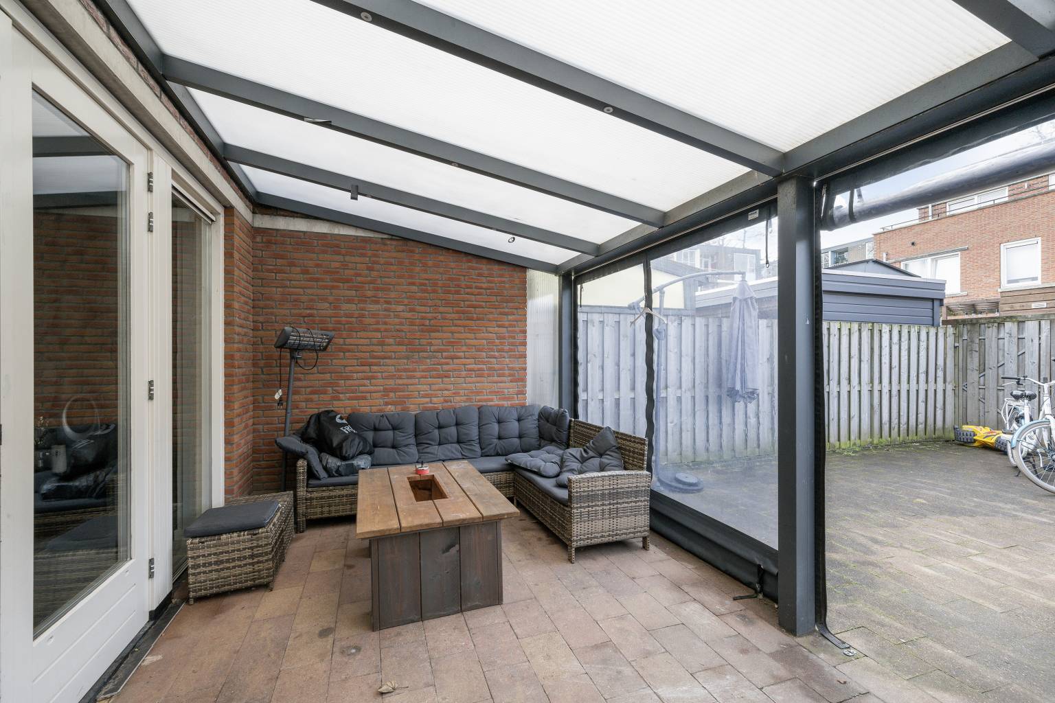 De diepe achtertuin is voorzien van een overkapping die aan de woning is geplaatst. Deze kan worden afgesloten met zeildoeken. De tuin is volledig voorzien van tegels met rondom houten schuttingen als afscheiding. Achterin de tuin staat een houten berging die is voorzien van elektra en er is een achteruitgang.