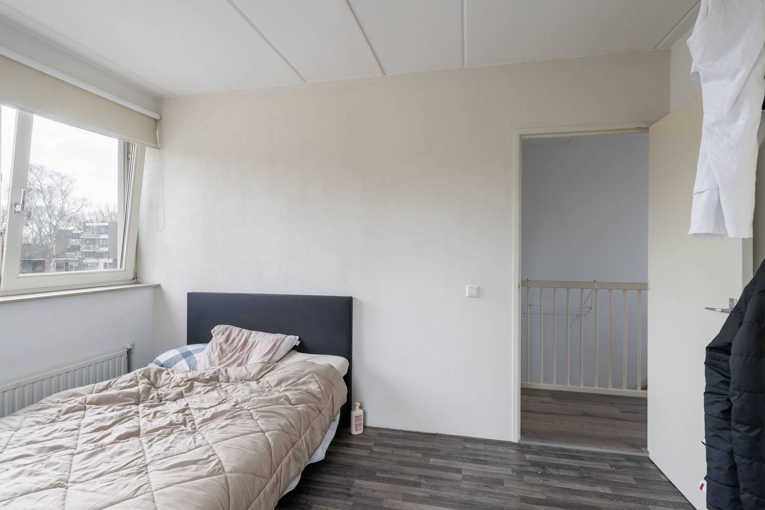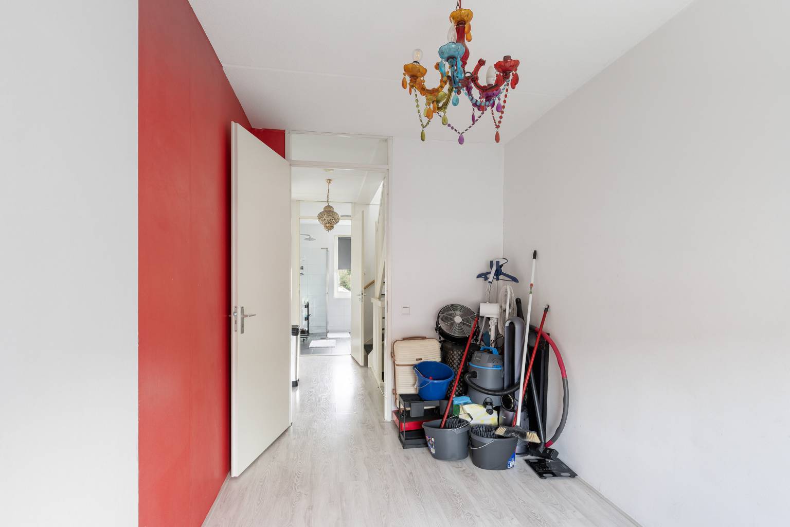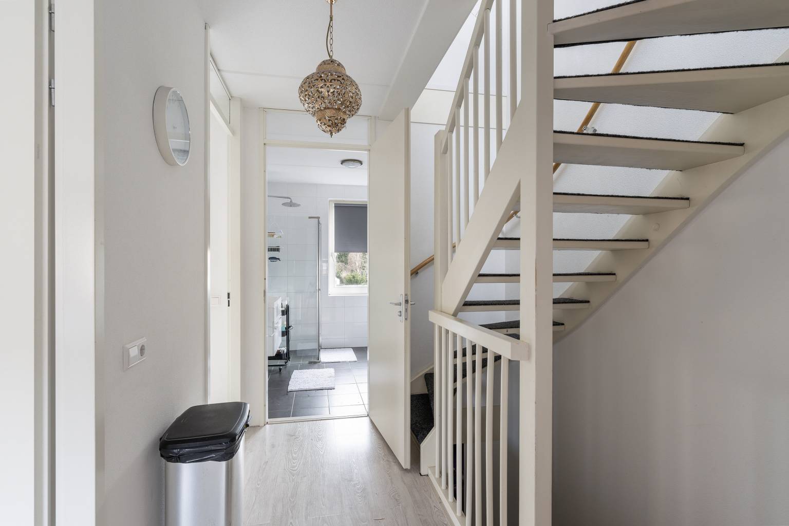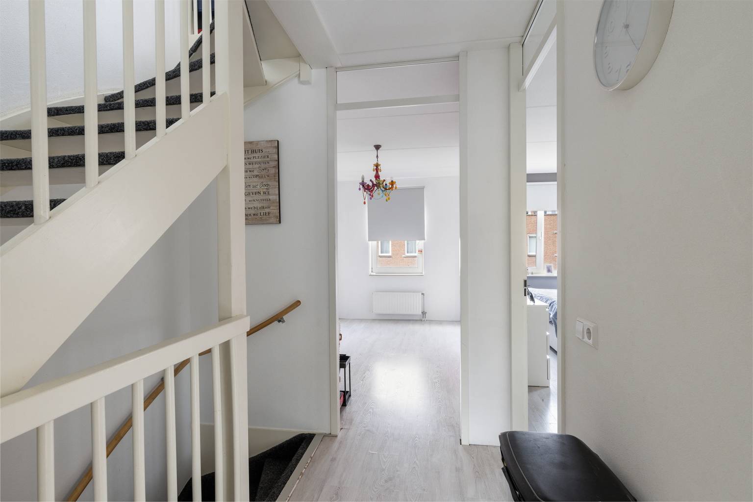 Na de trapopgang is de overloop bereikbaar, die toegang geeft tot de trap naar de 2e verdieping, drie slaapkamers en de badkamer. Alle wanden zijn afgewerkt met spachtelputz en er ligt een laminaatvloer, die is doorgetrokken naar alle slaapkamers.