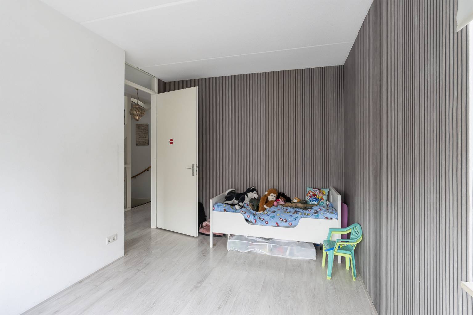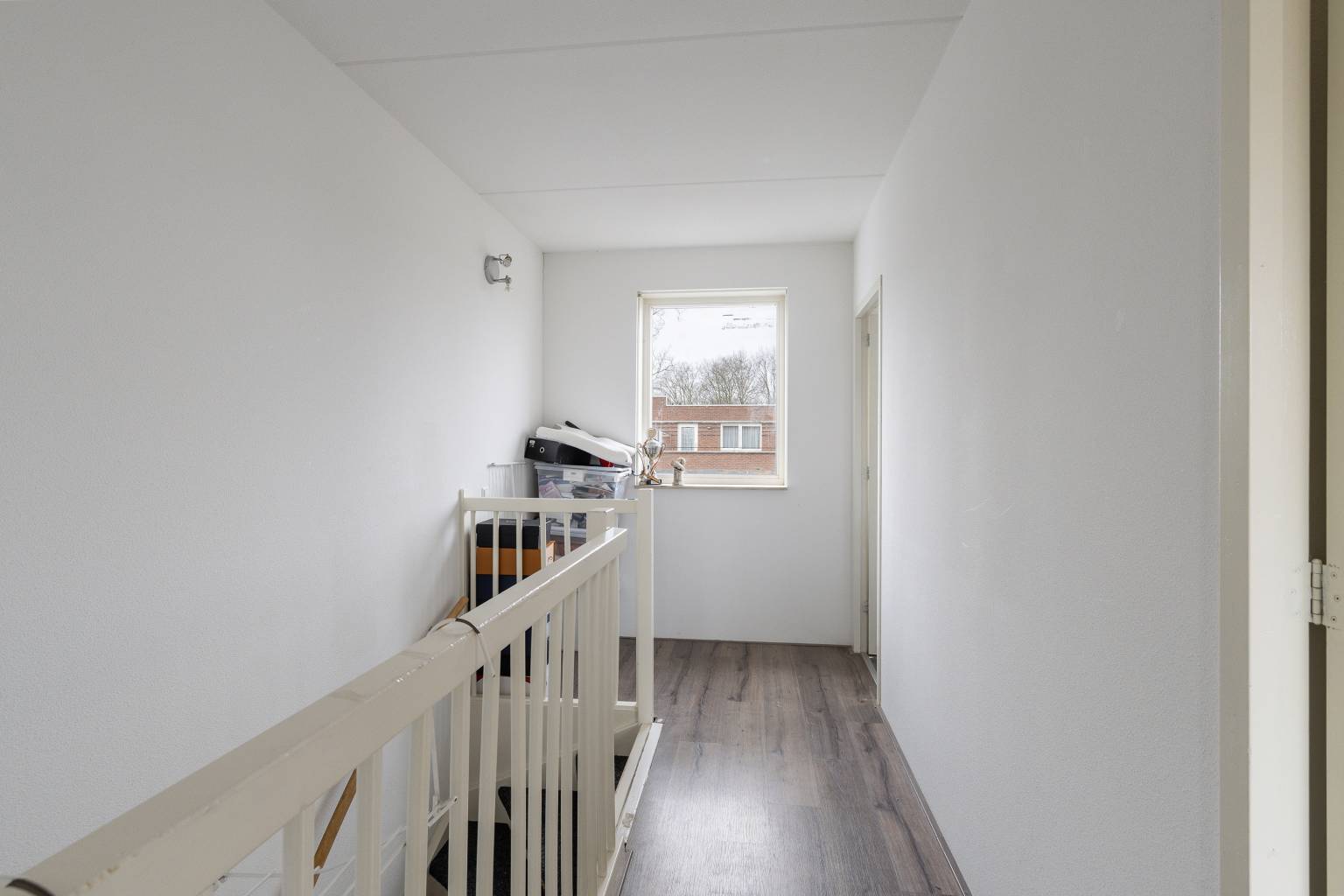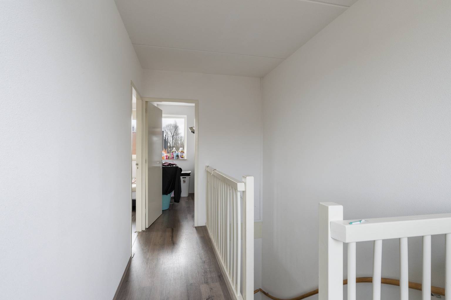 Vanaf deze overloop, met een laminaatvloer en spachtelputz wanden, is er toegang tot nog twee slaapkamers en de wasruimte.