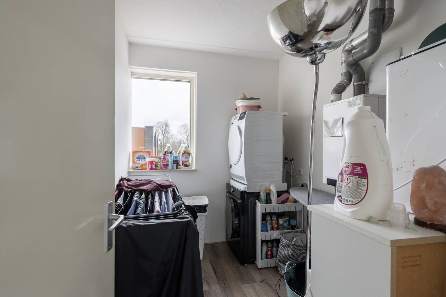 De wasruimte is een fijne extra ruimte met daarin de opstelling van de Cv-ketel en de wasmachine-/drogeraansluiting. Ook hier ligt een laminaatvloer, zijn de wanden afgewerkt met spachtelputz en is er een raam.