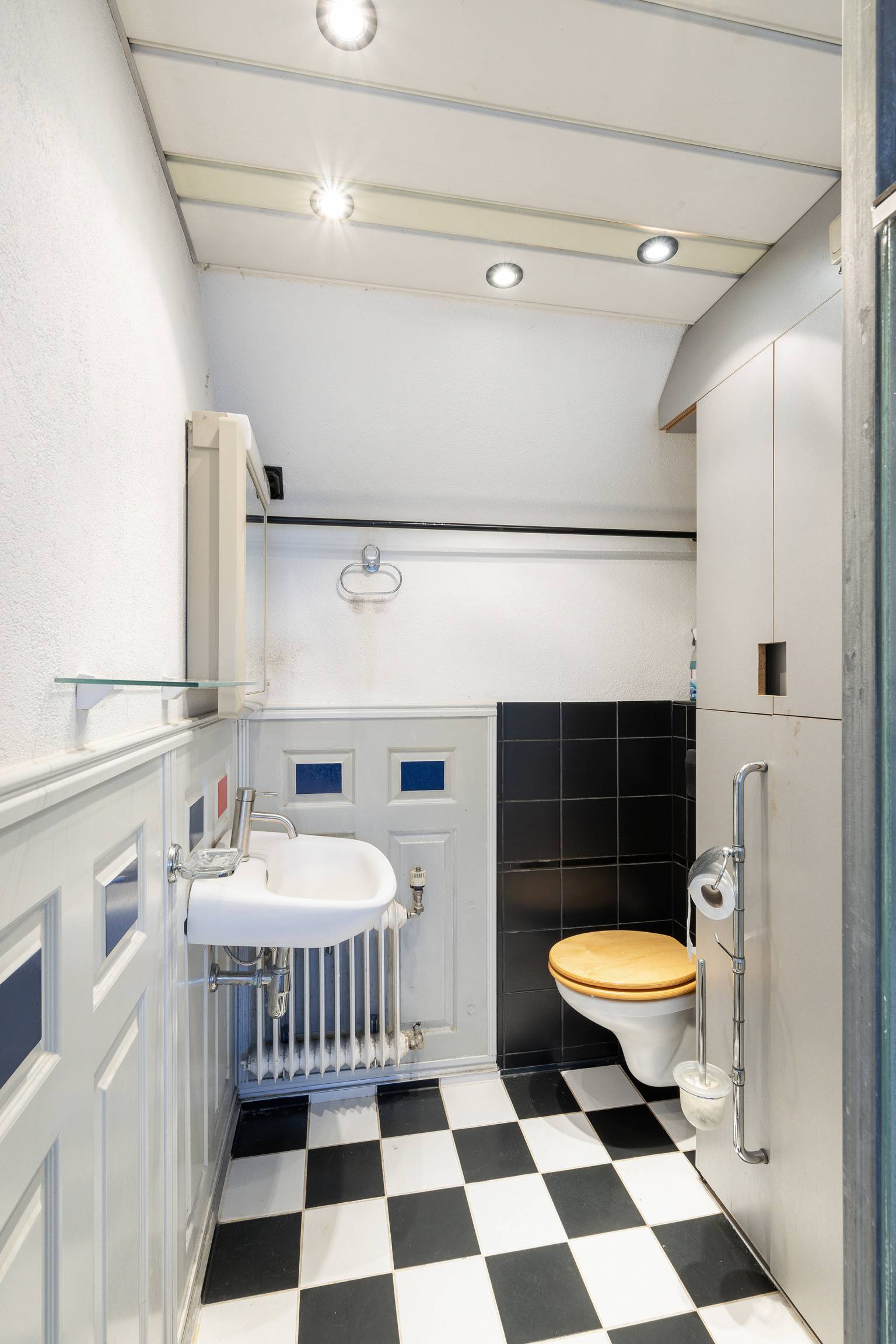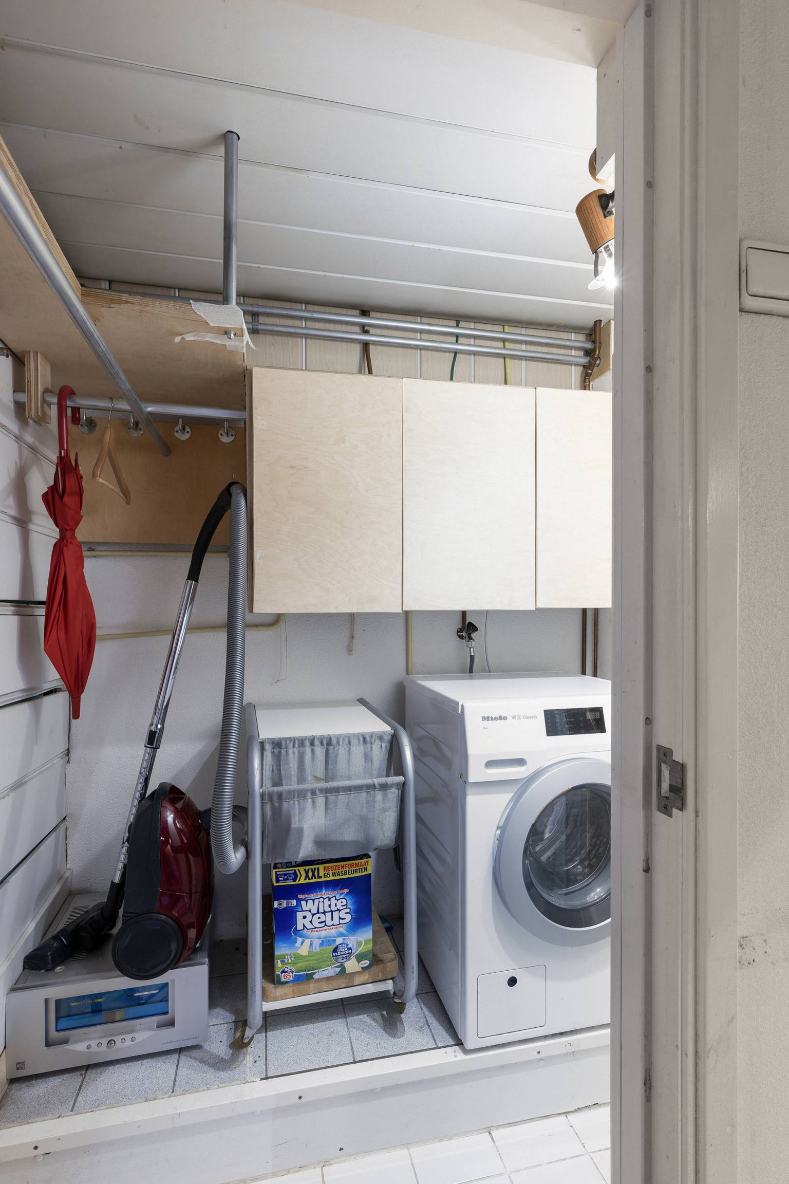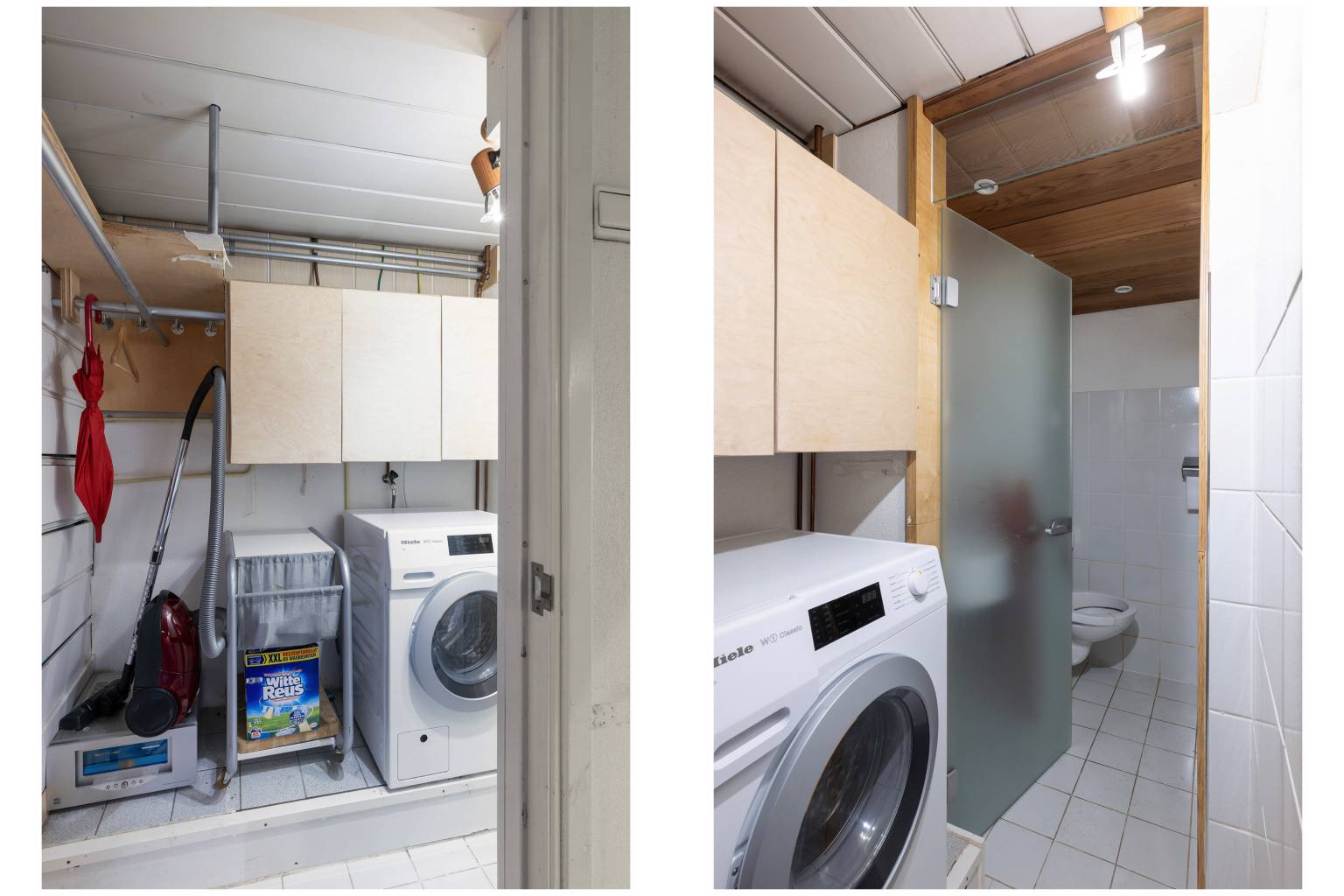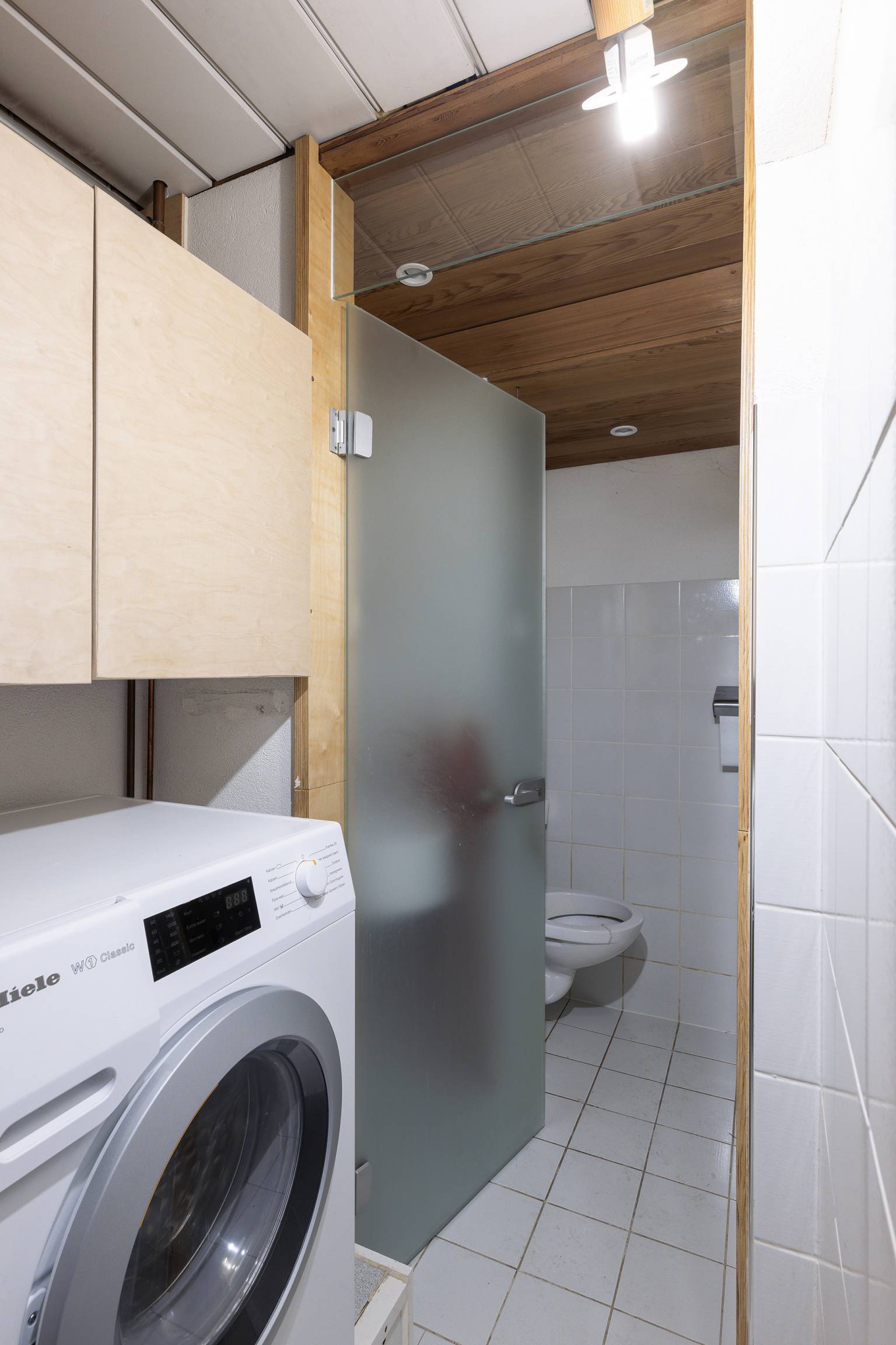 De wasruimte heeft een tegelvloer en een verhoging voor de wasmachine. De wanden zijn afwisselend afgewerkt met tegels, kunststof schroten en stucwerk. Het plafond is voorzien van kunststof schroten en er is een deur naar het toilet. Deze is volledig betegeld en het plafond is voorzien van inbouw spots.