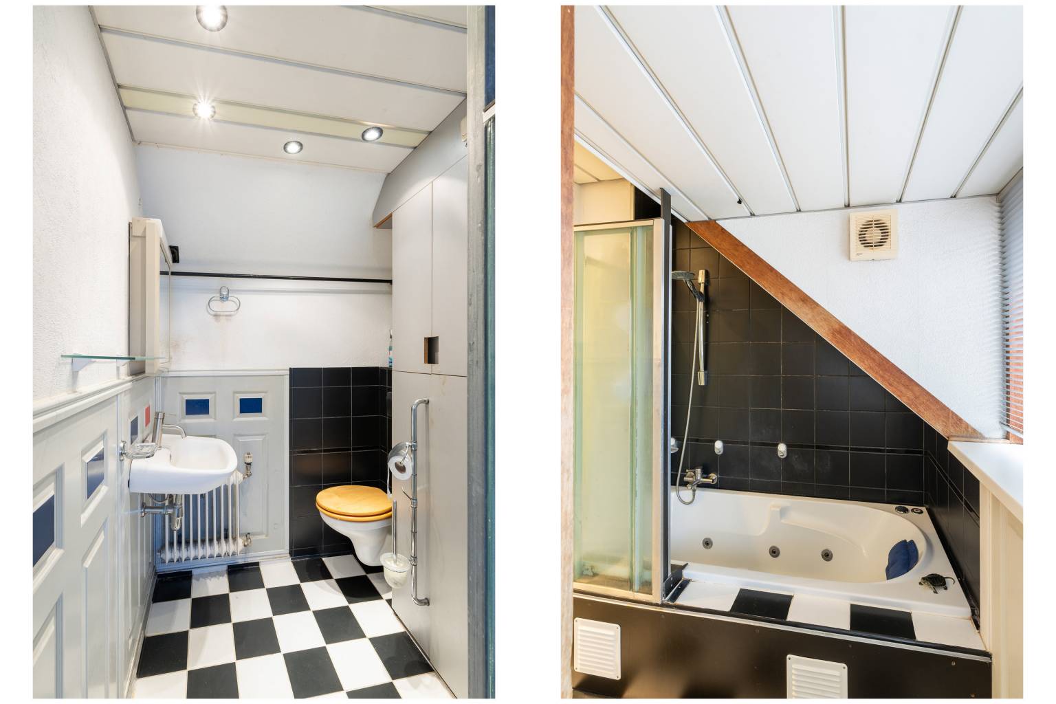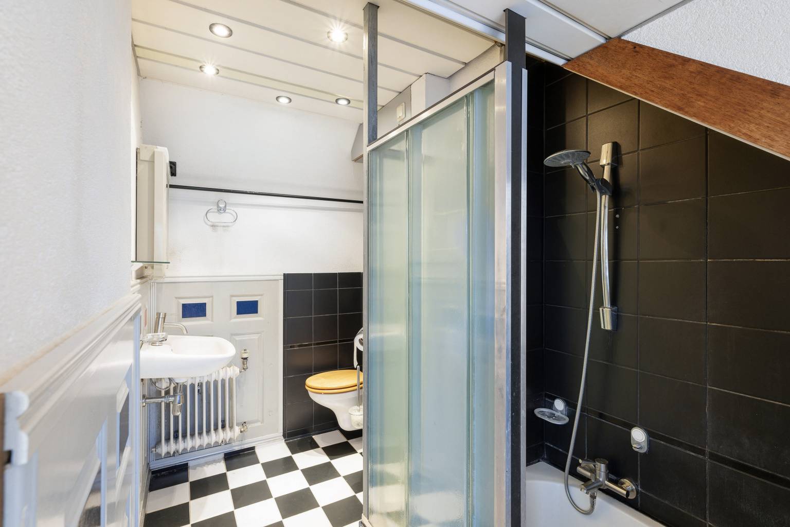 De badkamer is deels betegeld en uitgerust met een ligbad met een douche, een toilet en een wastafel. Er is een aparte kast met daarin de opstelling van de Cv-ketel en het plafond is voorzien van inbouw spots.