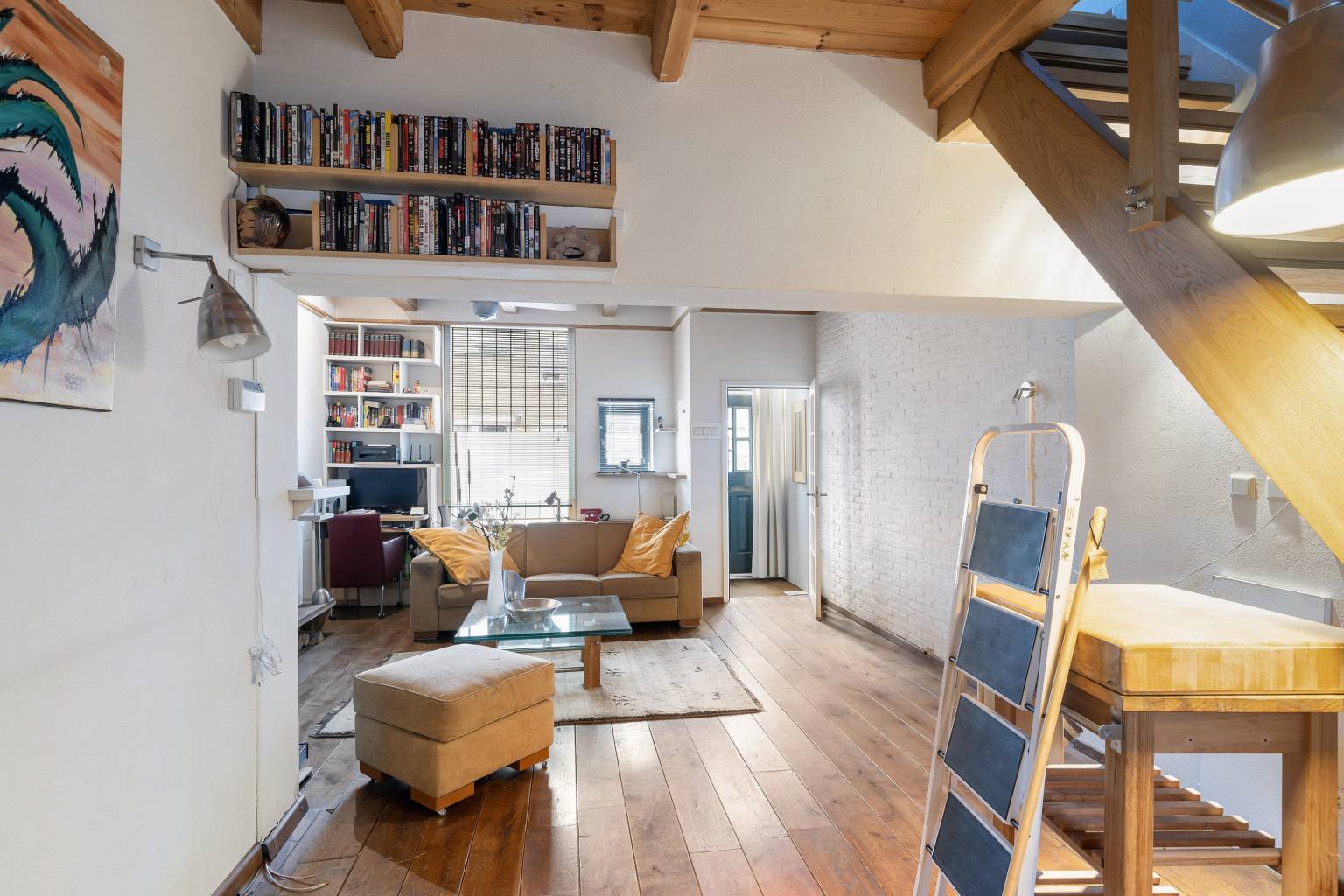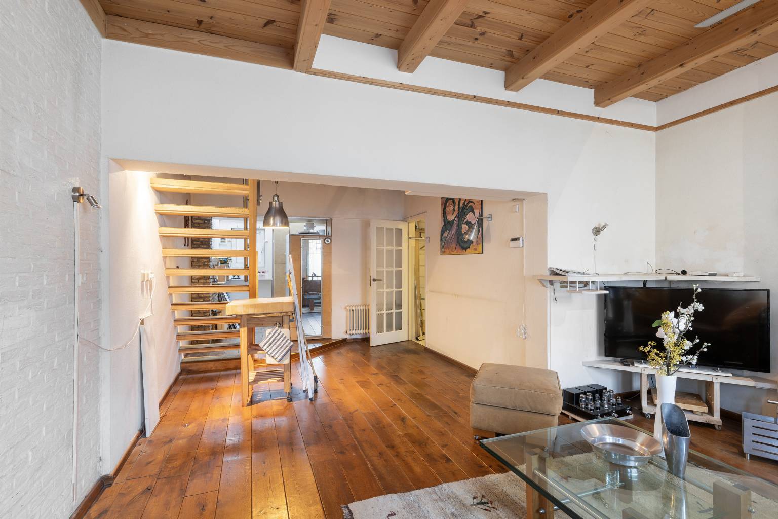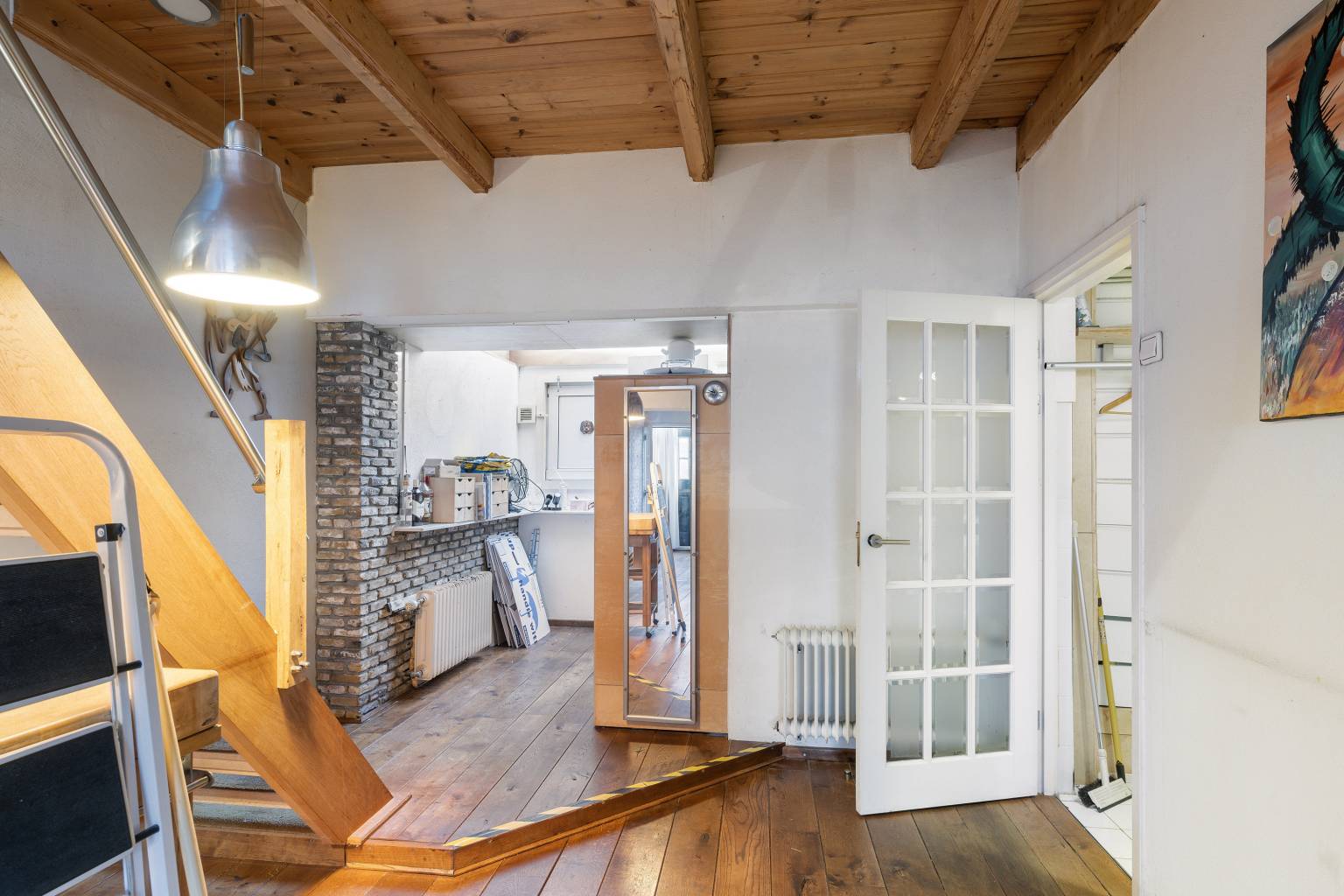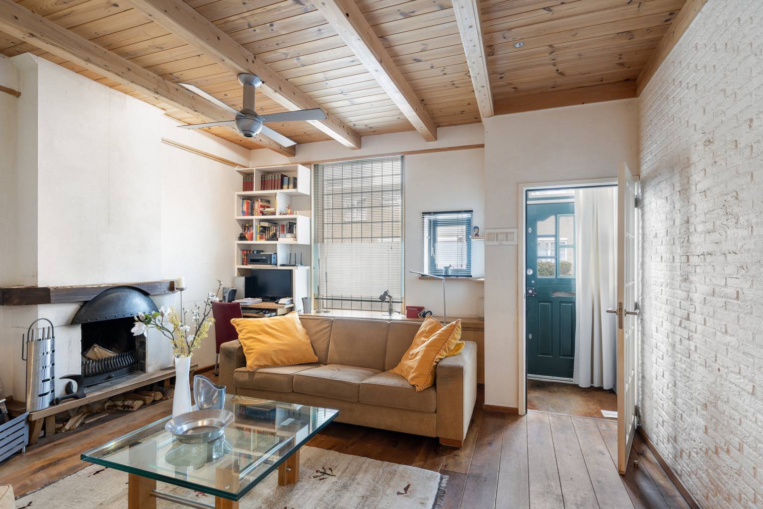 De voordeur is direct bereikbaar vanaf de straat en zorgt voor een binnenkomst in de afsluitbare entreehal, die is voorzien van een schoonloopmat en een raam richting de woonkamer. Vanuit de entreehal is er toegang tot de woonkamer, die is gelegen aan de voorzijde. Er ligt een nette houten vloer, het balken plafond is mooi in het zicht en er is een schouw aanwezig met een open haard. Via een ruime toog is er toegang tot een ruimte voor een eventuele eethoek, die overloop in een verhoging met de open trap naar de verdieping. Vanaf de verhoging is er tevens toegang tot de keuken en in de ruimte is er een aparte deur naar de wasruimte met het toilet.