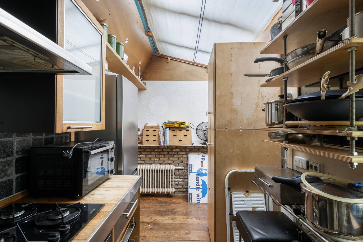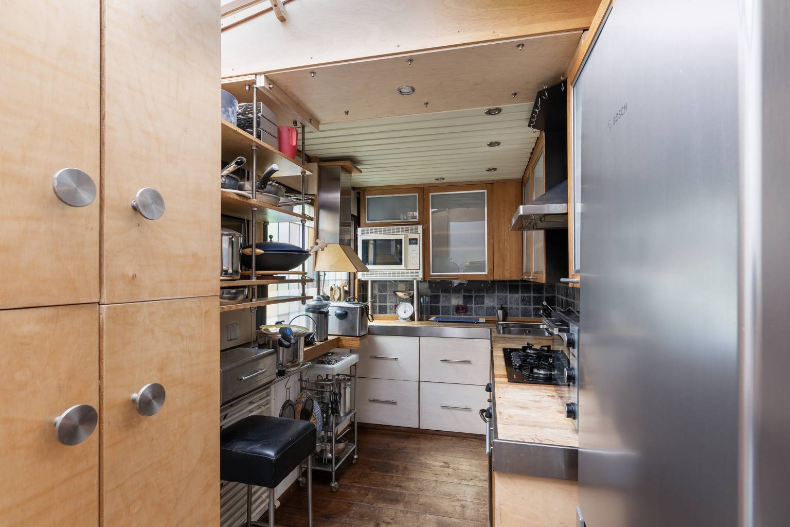 De keuken is geplaatst in de uitbouw en beschikt deels over een schuin glazen dak. Er zijn ramen aanwezig en er is een deur richting de steeg. De keuken zelf is opgesteld in een L-vorm met bovenkasten. De achterwand is betegelden er is diverse apparatuur aanwezig. Ook hier ligt een houten vloer en is het plafond voorzien van inbouw spots.