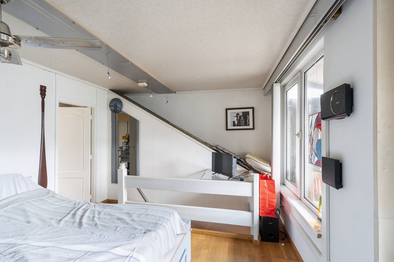 Na de trapopgang is er een bovenkomst in de slaapkamer. Deze is gelegen aan de achterzijde en beschikt over een vaste kast en openslaande deuren naar het balkon. Er ligt een houten vloer en de wanden zijn voorzien van stucwerk. Vanuit de slaapkamer is er toegang tot een tweede kamer.