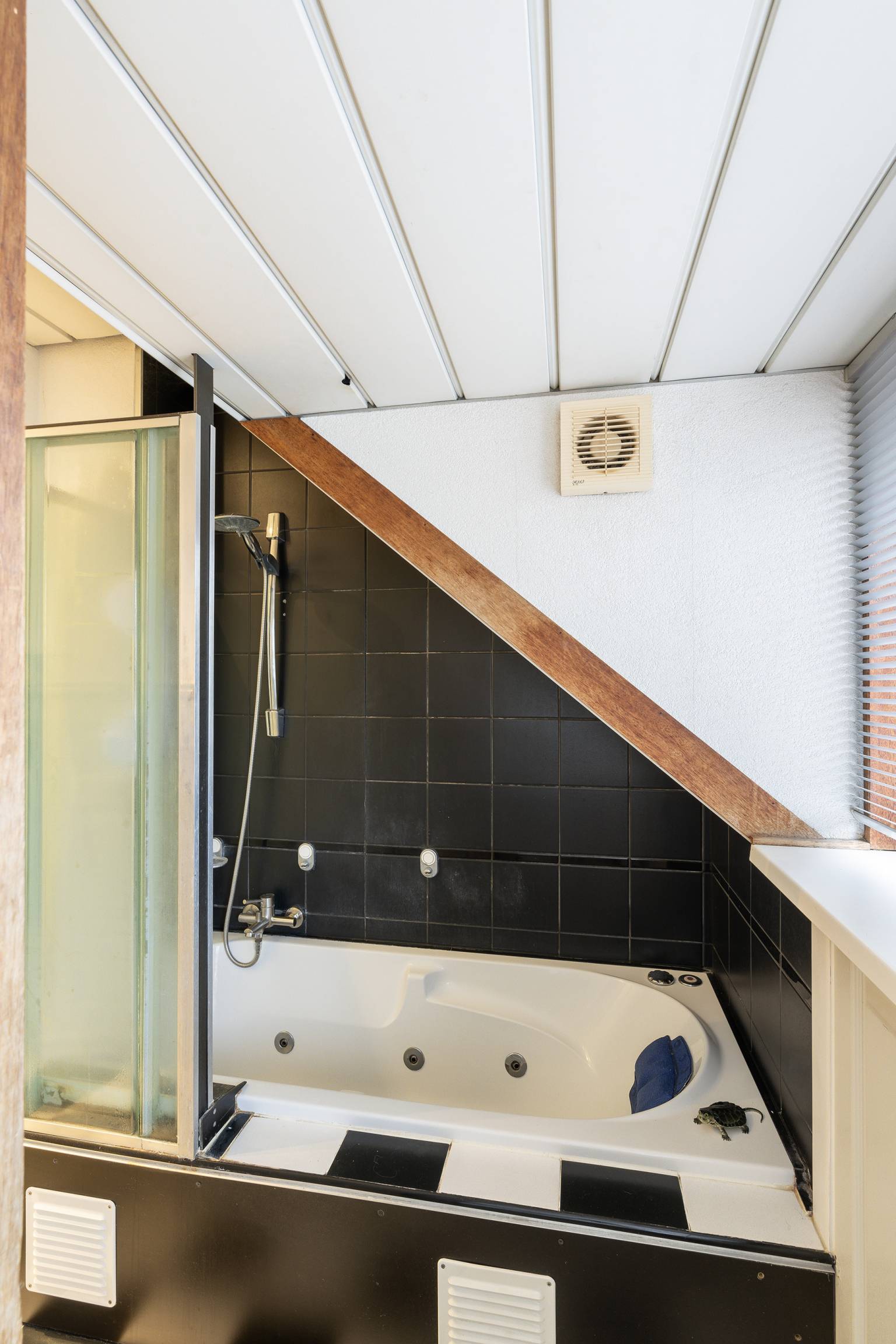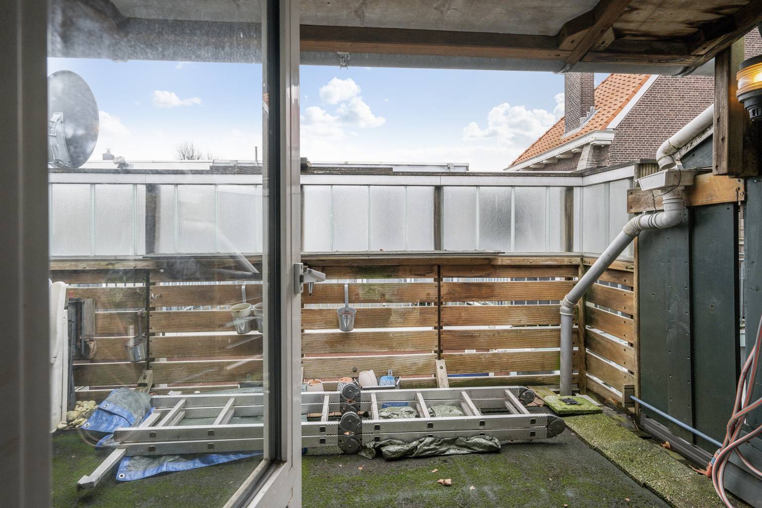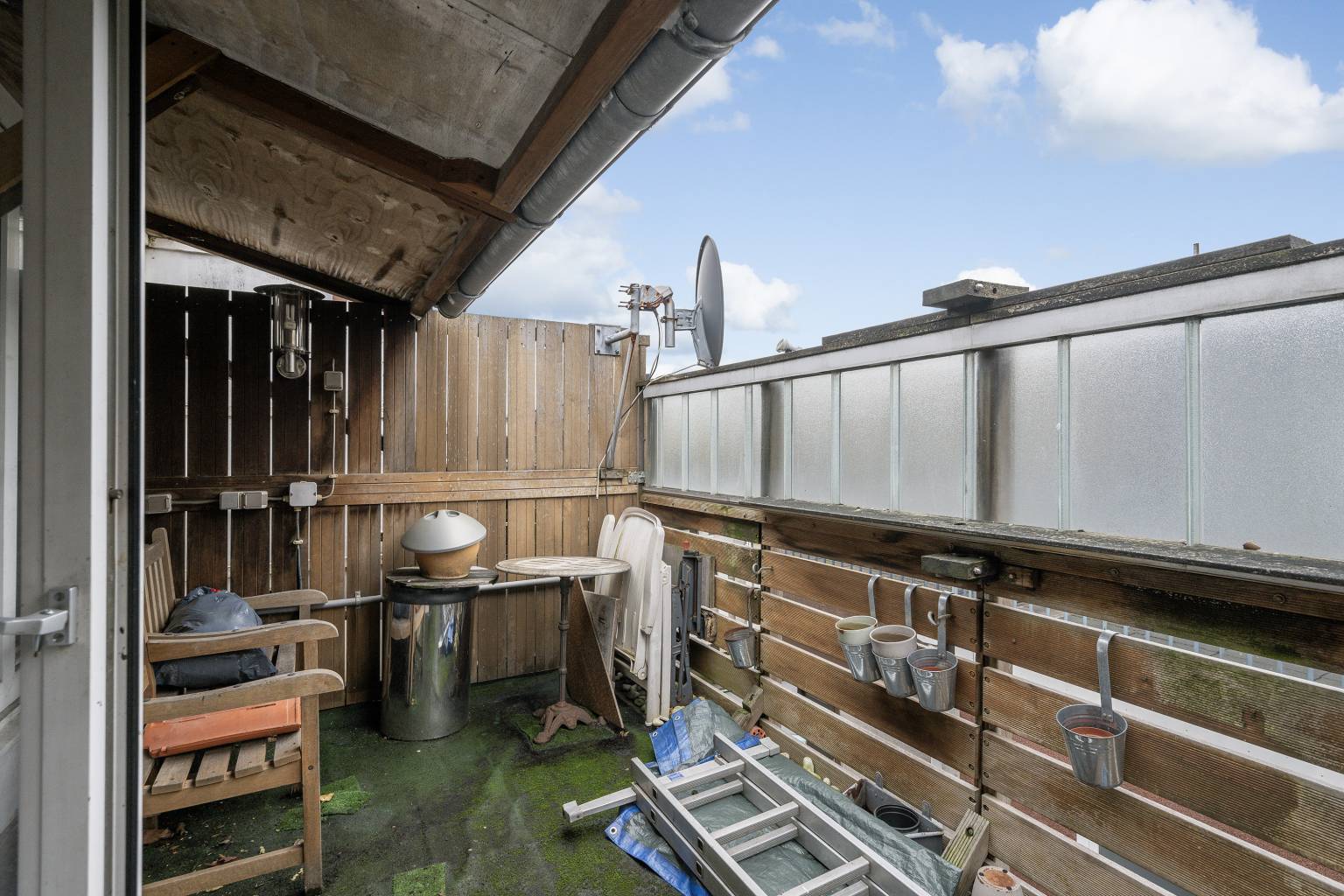 Het balkon is deels overkapt en voorzien van een houten schutting. De houten balustrade is bovenop voorzien van melkglazen panelen en er is elektra aanwezig.