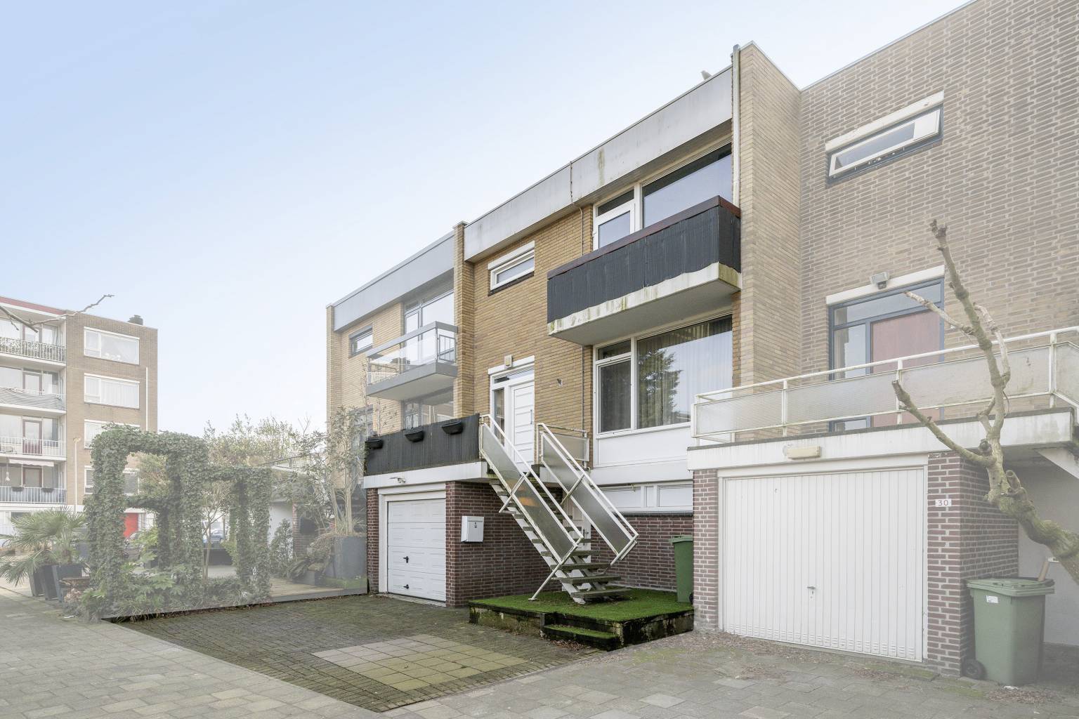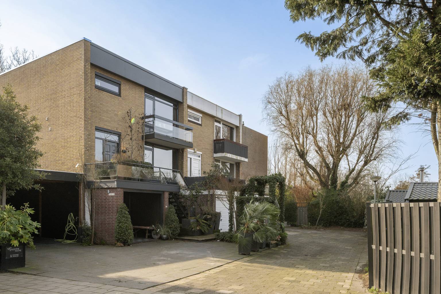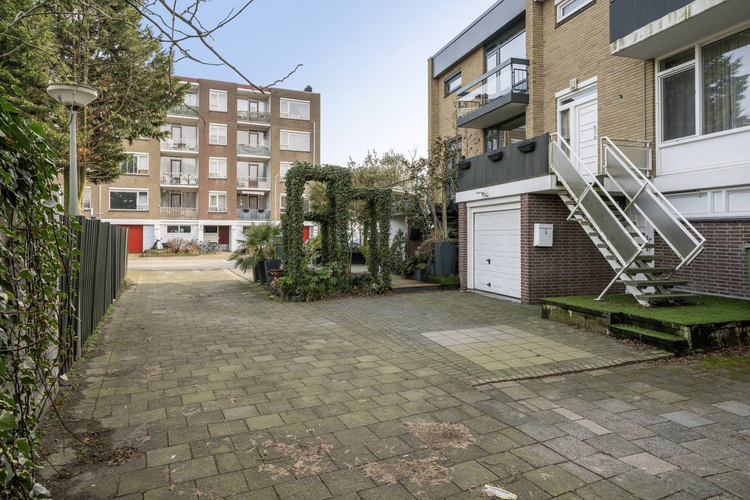Vanaf de gezamenlijke oprit is er een vrij toegankelijke toegang tot de voortuin, die plaats biedt voor het parkeren van een auto en toegang geeft tot de garage, een small entreedeur op de begane grond en de trap naar het bordes met de voordeur.