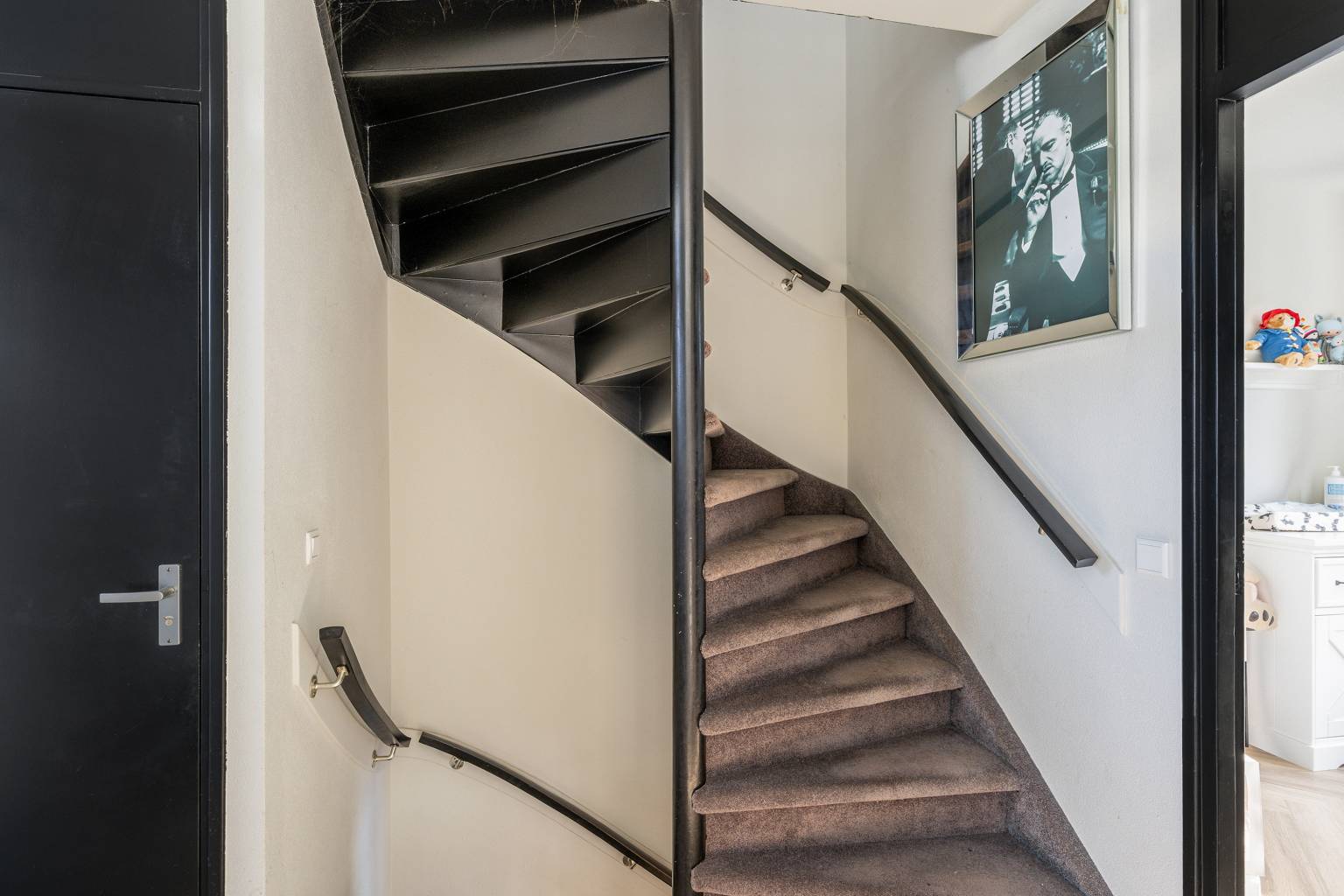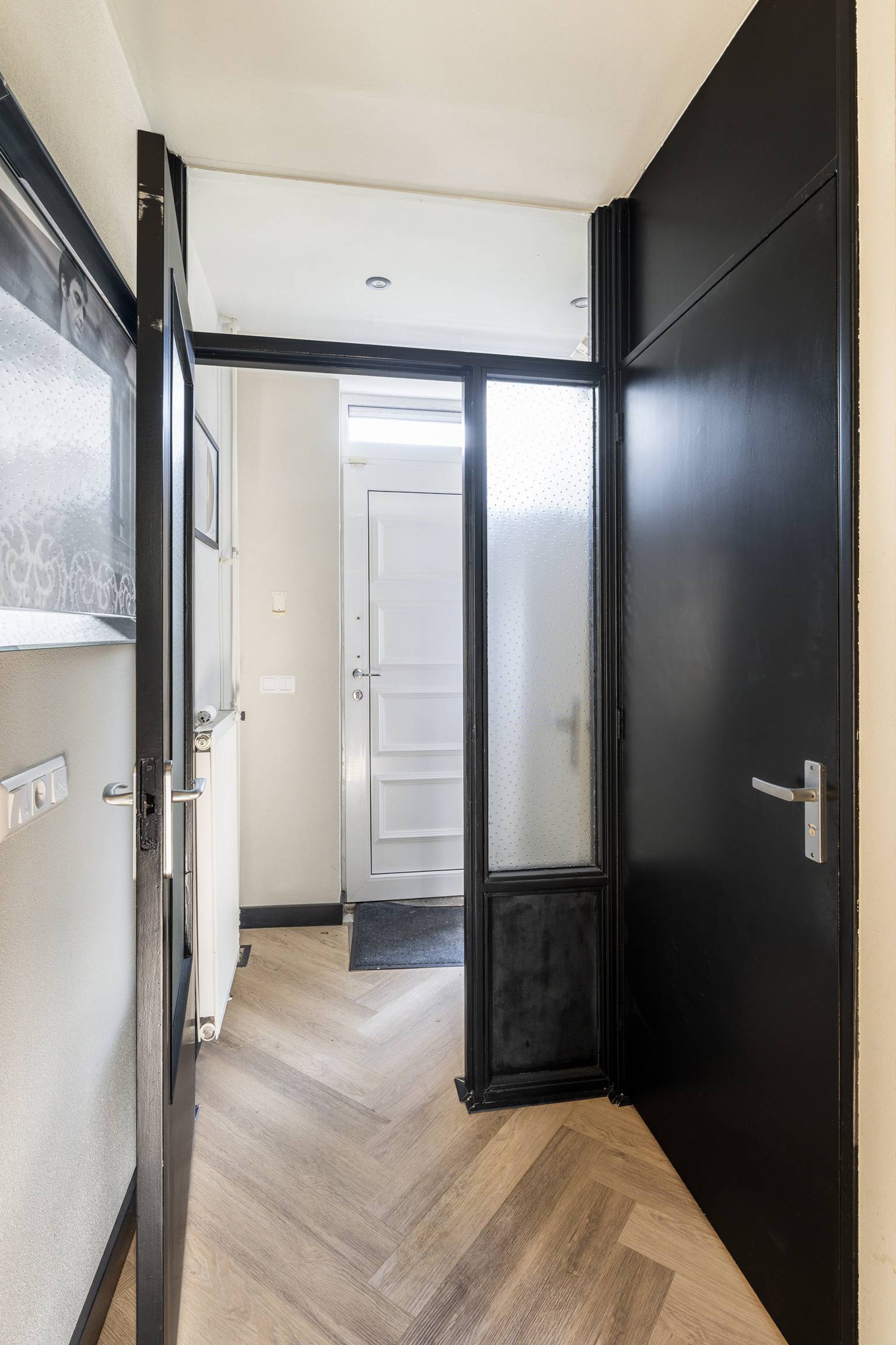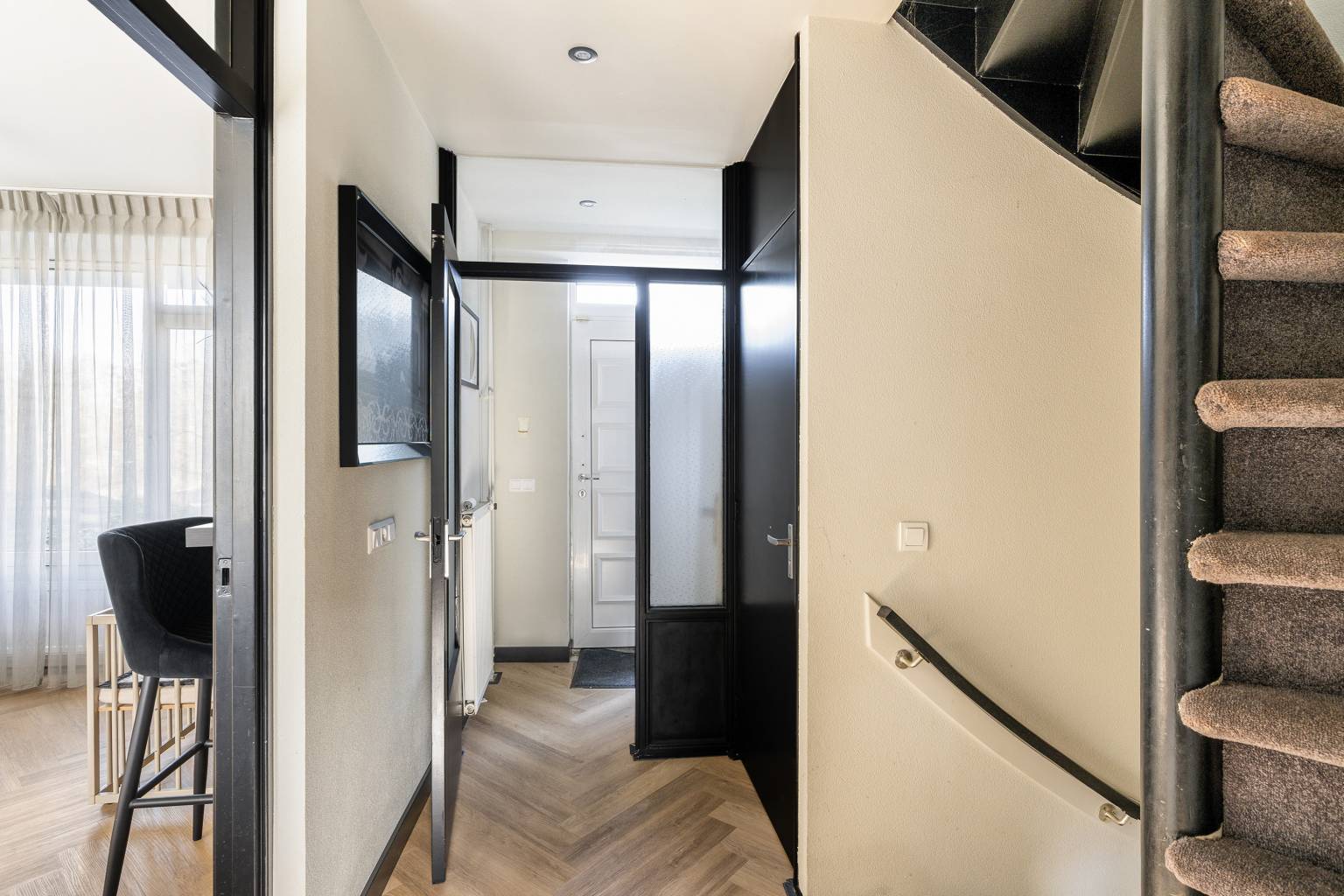 Via de trapopgang is de overloop bereikbaar. Deze geeft toegang tot de trap naar de 2e verdieping, de afsluitbare entreehal met de voordeur en een vaste kast, het toilet, de woonkamer en de eerste slaapkamer. Op deze verdieping zijn de wanden gestuukt en ligt er een visgraat laminaatvloer.