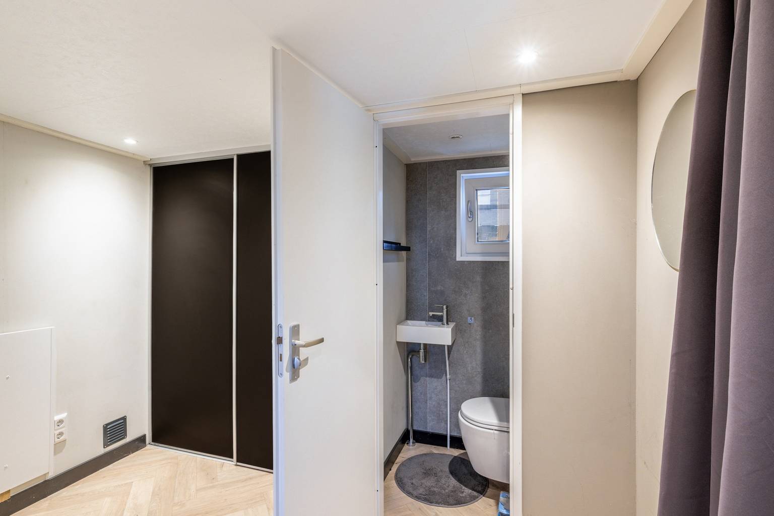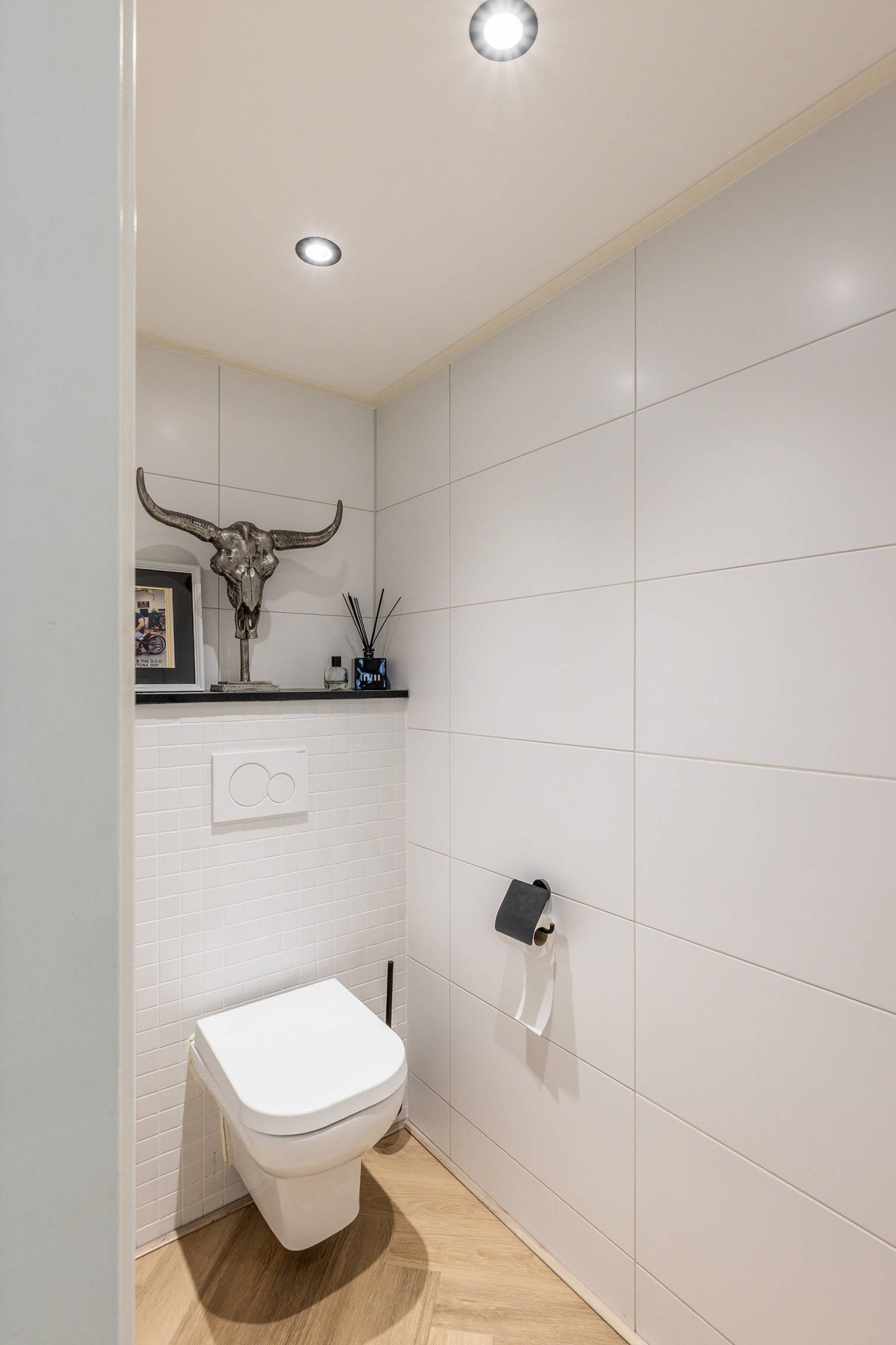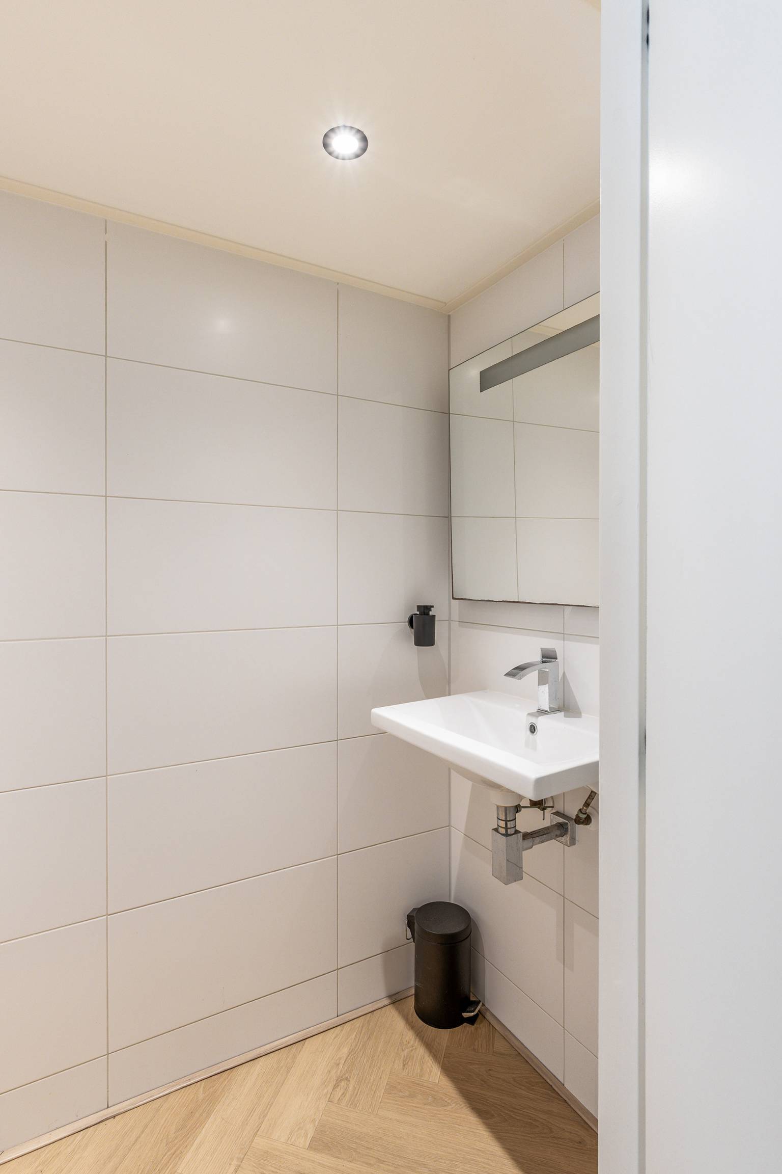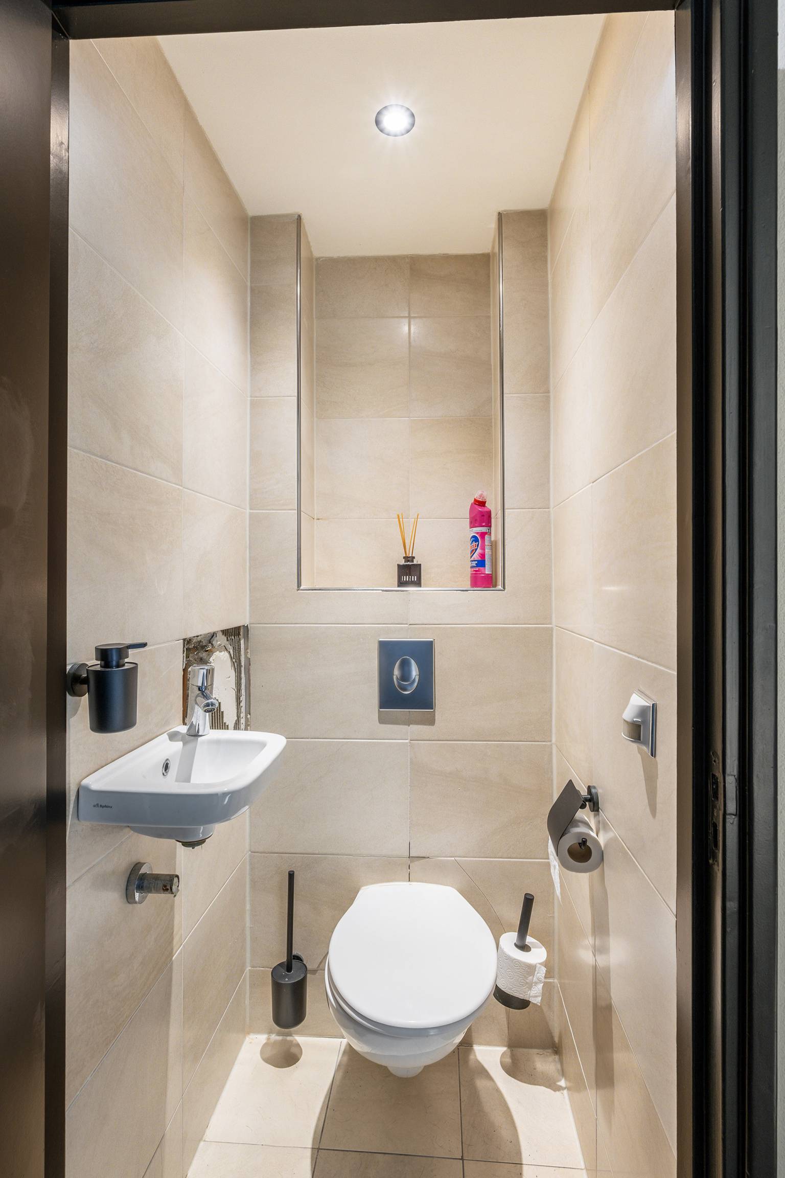 Het toilet is volledig betegeld en voorzien van een zwevend toilet met een nis in de achterwand, een fonteintje en een inbouw spot.