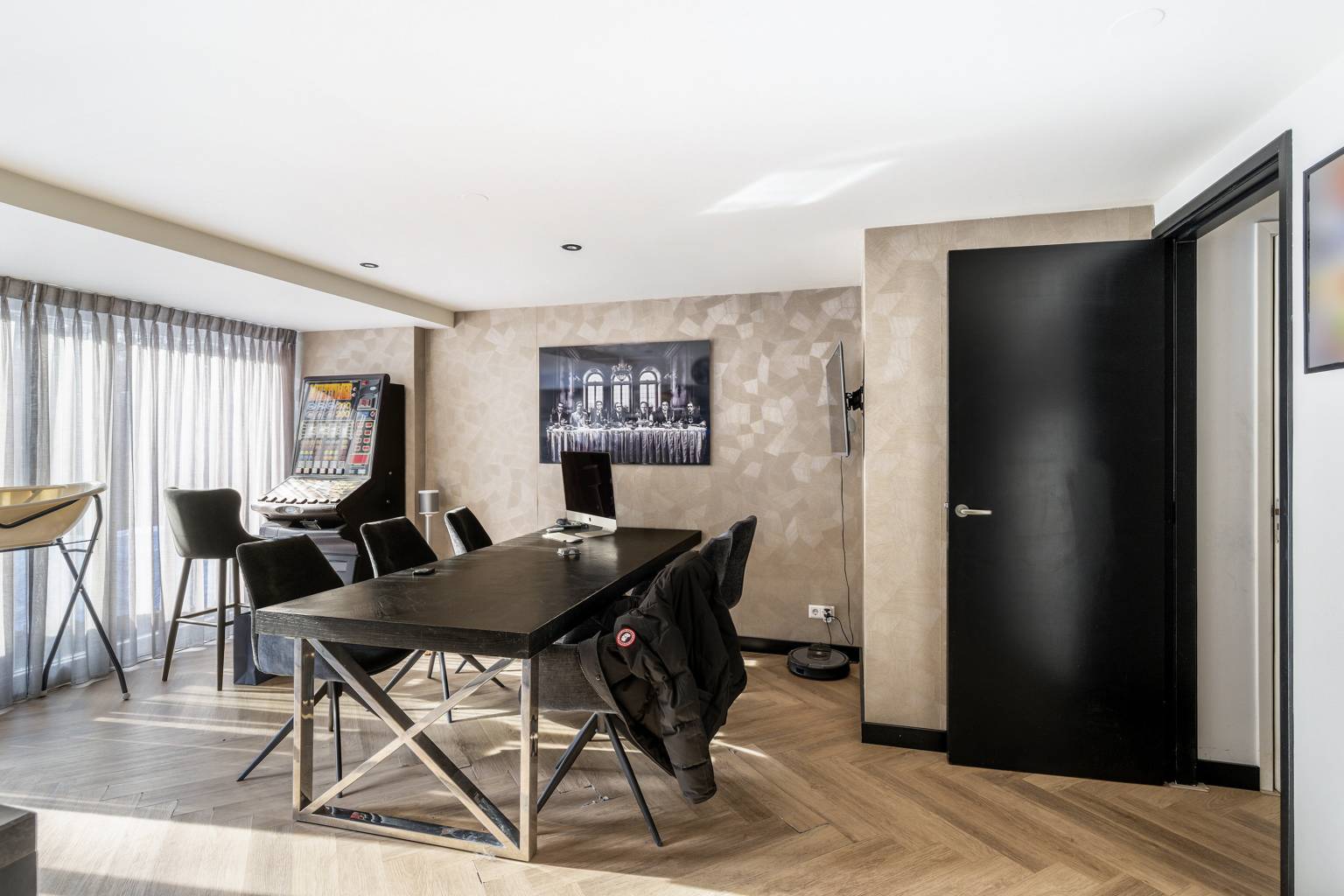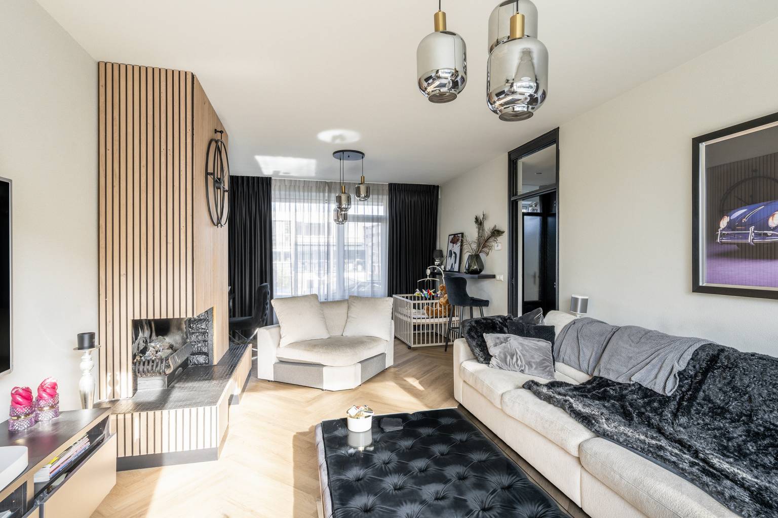 De woonkamer loopt van de voorzijde naar de achterzijde en heeft veel lichtinval dankzij de ramen aan weerszijden. De brede open haard is voorzien van houten latten, er hangt airconditioning en er is een deur naar het balkon aan de achterzijde. Deze is voorzien van een balustrade met glazen panelen en aan de gevel hangt een zonnescherm.