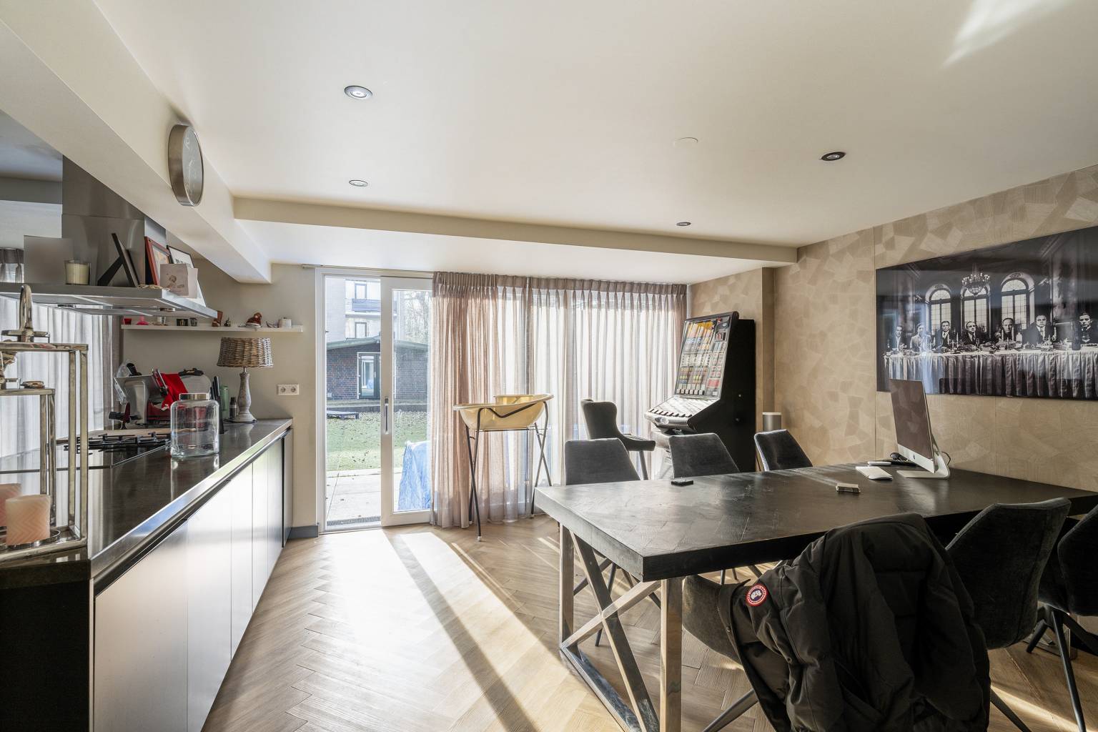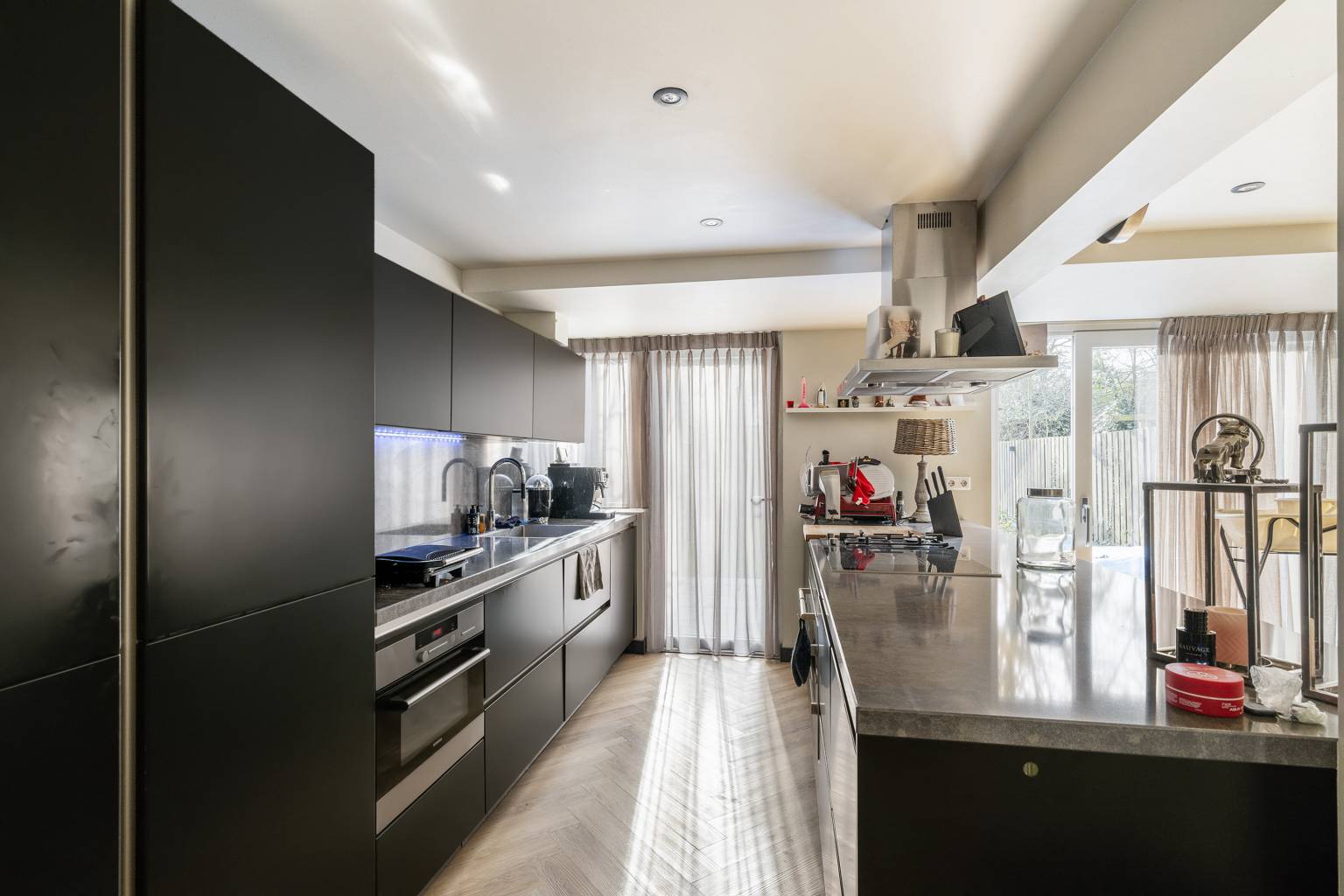 Via de gezamenlijke oprit bereik je de royale voortuin met eigen parkeerplaats en toegang tot de inpandige garage. De garage is niet alleen praktisch met vaste kasten, elektra, verlichting en aansluitingen voor wasmachine en droger, maar vormt ook een directe verbinding met de verrassend ruime woonkeuken op de begane grond. Deze sfeervolle leefruimte is afgewerkt met een visgraat laminaatvloer, gestuukte wanden en inbouwspots en beschikt over een recht keukenblok met hoge kasten, diverse apparatuur en een groot kookeiland dat op natuurlijke wijze overloopt in het zit- en eetgedeelte. De schuifpui en de deur naar de diepe achtertuin zorgen voor een fijne lichtinval en een directe verbinding met buiten. De tuin zelf biedt een betegeld terras, kunstgras, een vlonderterras, een zonnescherm en een stenen tuinhuis dat compleet is ingericht met een woonkamer, keukenblokje, aparte kamer en eigen toilet. Ideaal voor inwonende kinderen, mantelzorg of werken aan huis. Op de eerste verdieping bevindt zich de lichte woonkamer met ramen aan voor- en achterzijde, een brede gas open haard met houten latten als blikvanger, airconditioning en toegang tot het balkon met glazen balustrade. Ook hier is de afwerking strak met gestuukte wanden en een visgraat laminaatvloer. Daarnaast vind je op deze verdieping een slaapkamer en een modern, volledig betegeld toilet. De tweede verdieping telt nog drie slaapkamers, waaronder een royale hoofdslaapkamer met airconditioning en balkon aan de voorzijde en een moderne badkamer met ligbad, douche, dubbel wastafelmeubel en vloerverwarming. Met kunststof kozijnen met dubbel glas, elektrische zonneschermen, vloerverwarming in keuken en badkamer, een nieuwe cv-ketel uit 2025, energielabel C en gelegen op eigen grond, biedt deze woning niet alleen ruimte maar ook comfort en duurzaamheid. Een heerlijk compleet familiehuis met mogelijkheden, op een rustige plek in Vlaardingen West.
