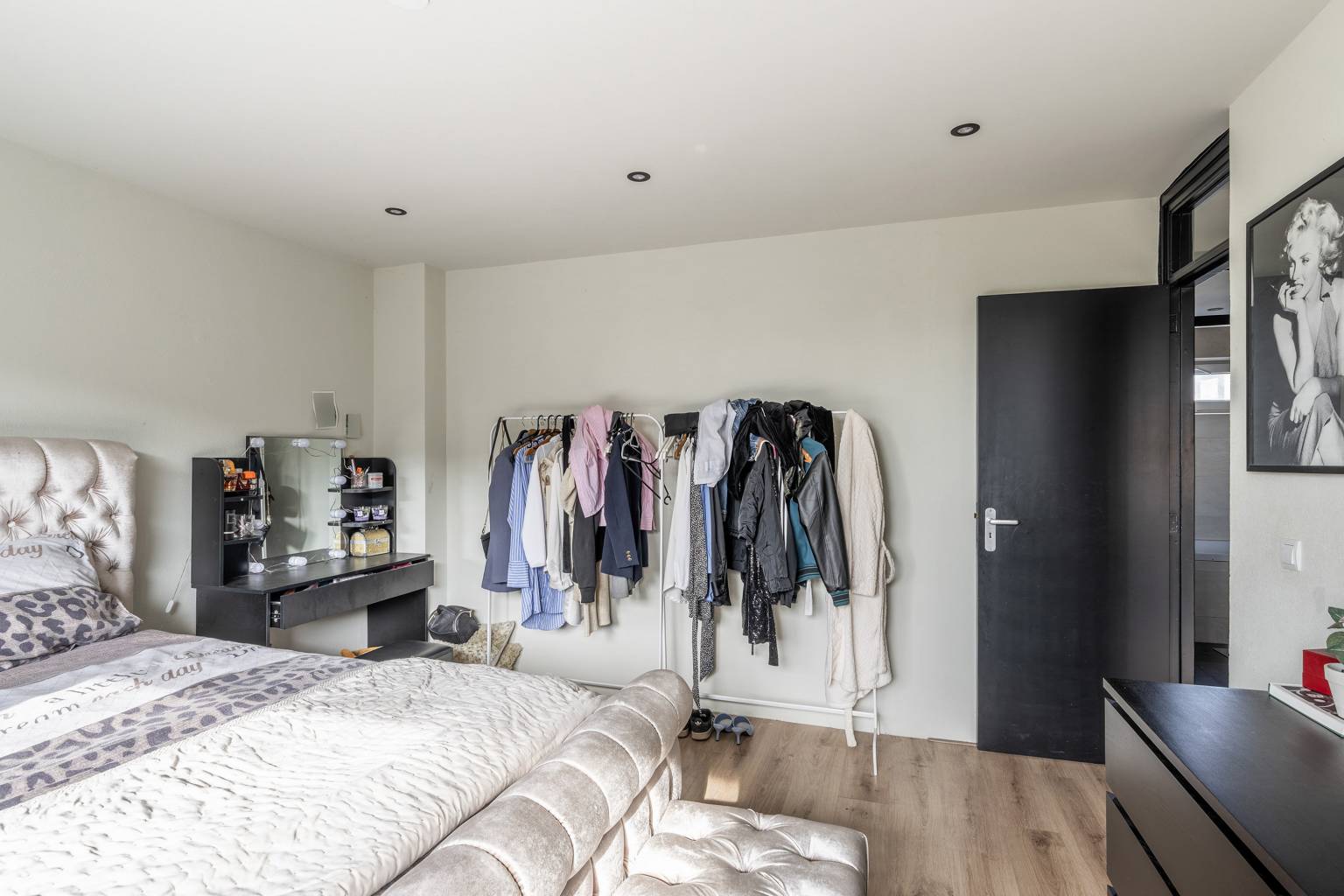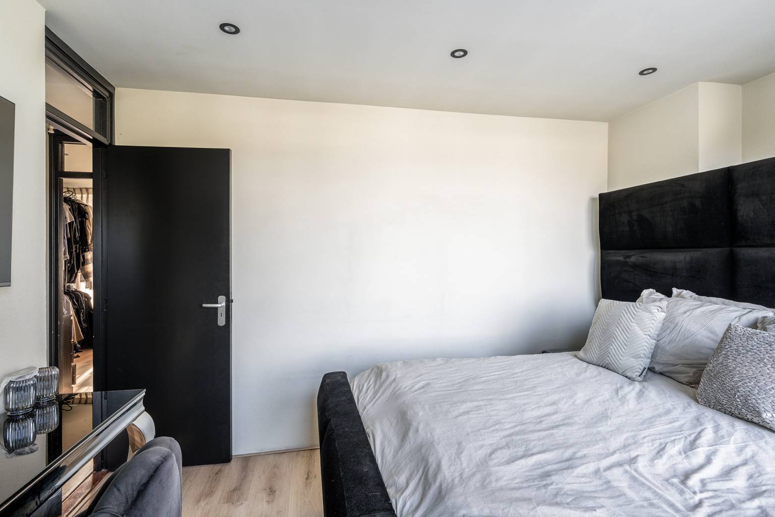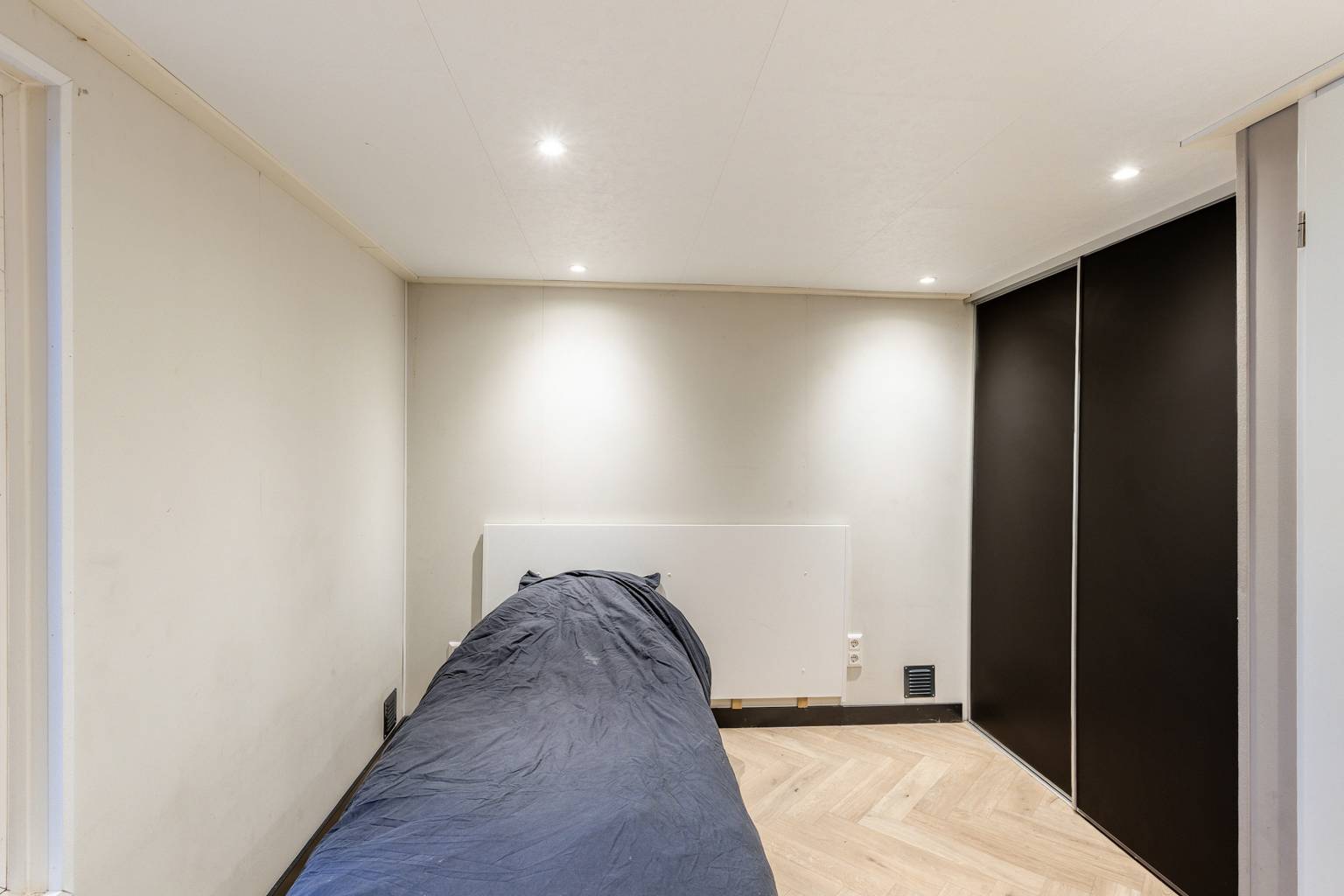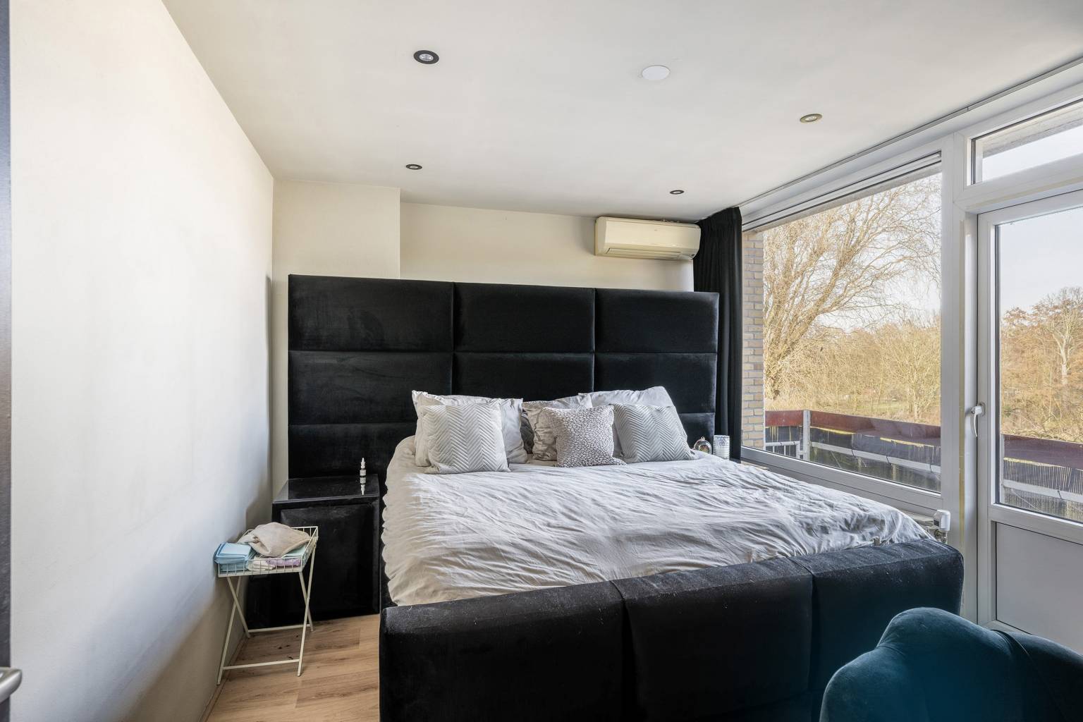 De eerste slaapkamer is gelegen naast de woonkamer en heeft eveneens een deur naar het balkon.