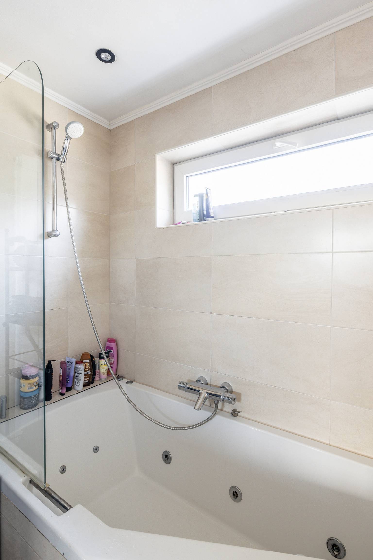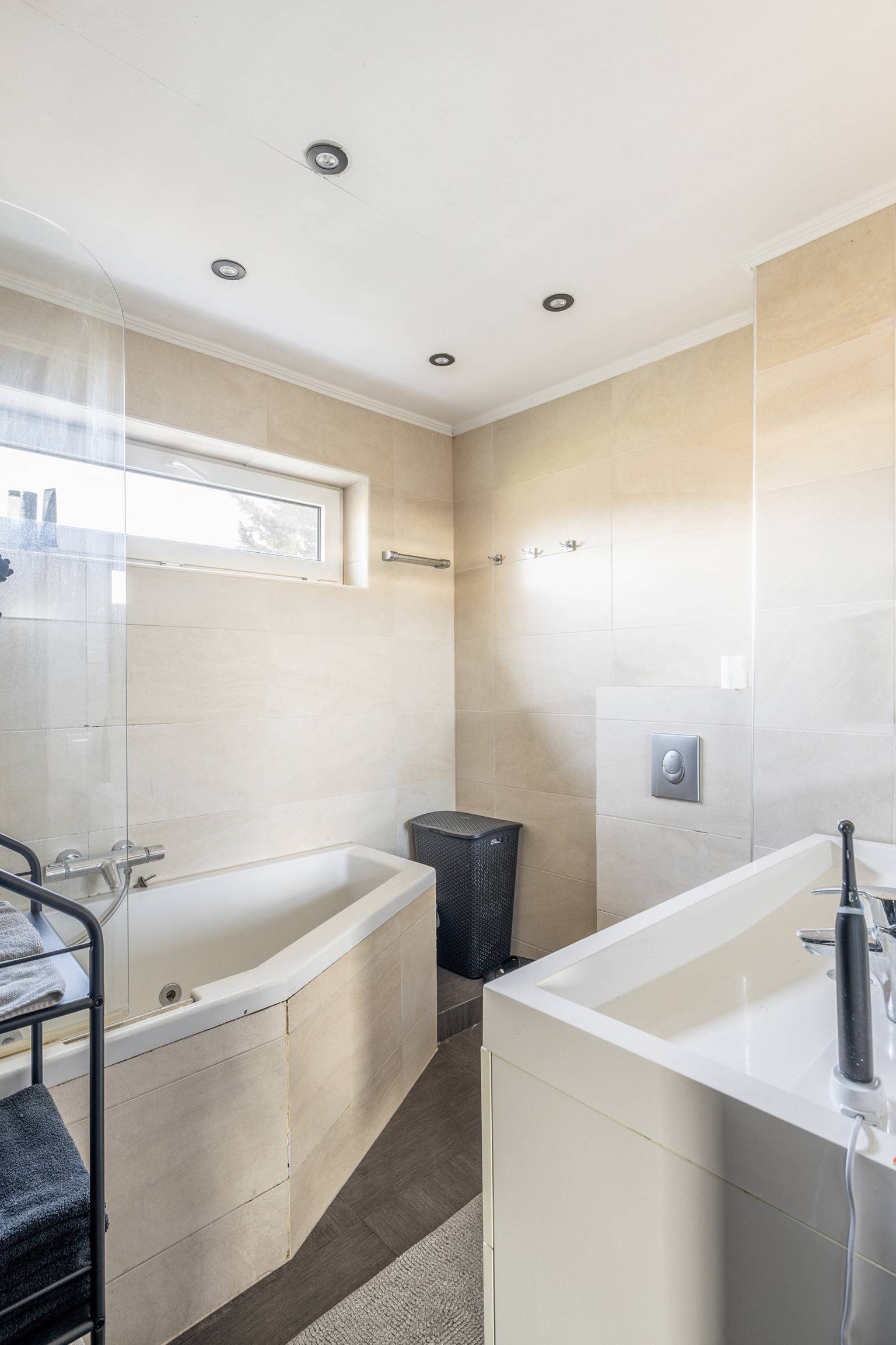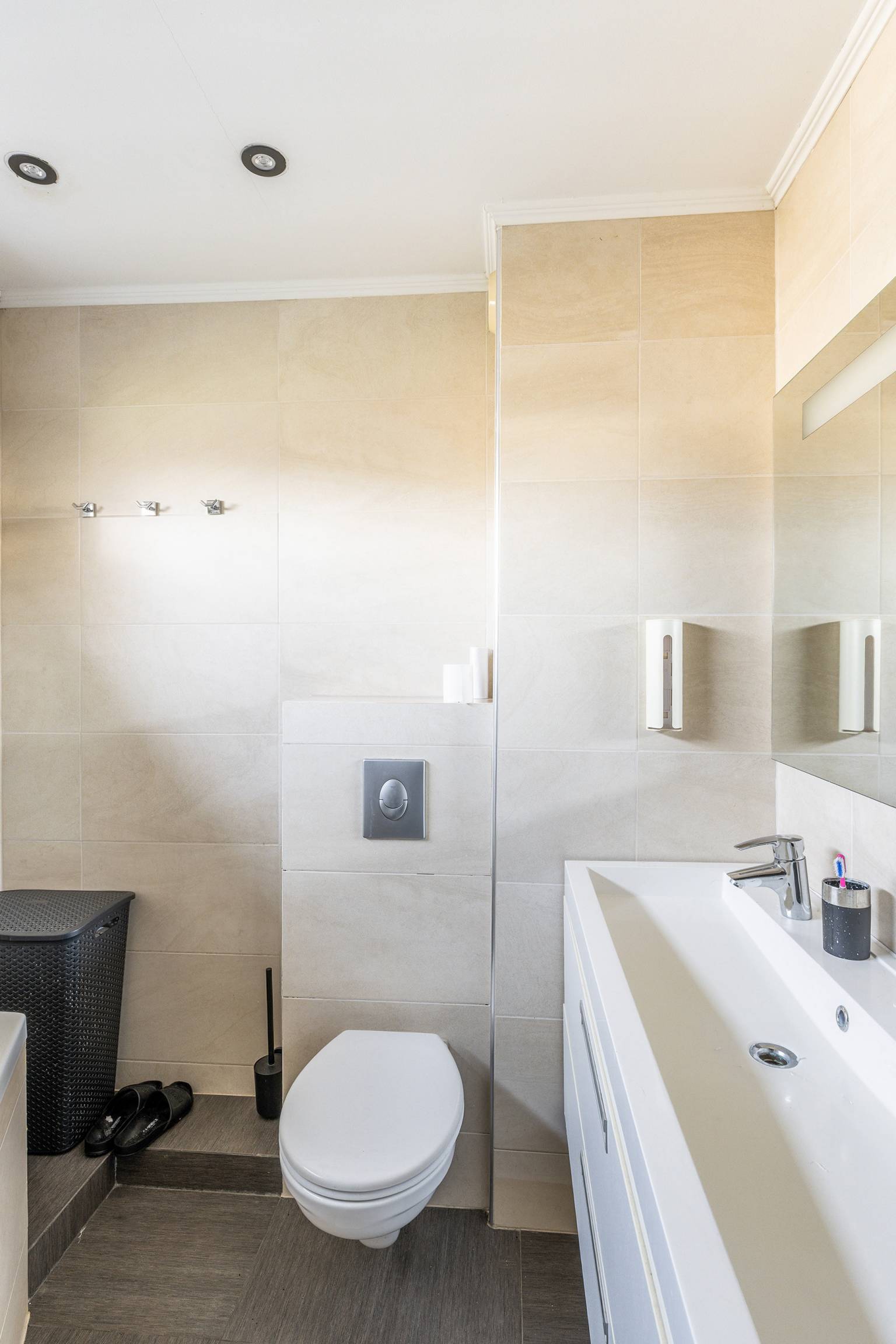 De volledig betegelde badkamer is uitgerust met een ligbad met douche, een dubbel wastafelmeubel met daarboven een spiegel en een zwevend toilet. Er is een te openen raam en het plafond is voorzien van inbouw spots.
