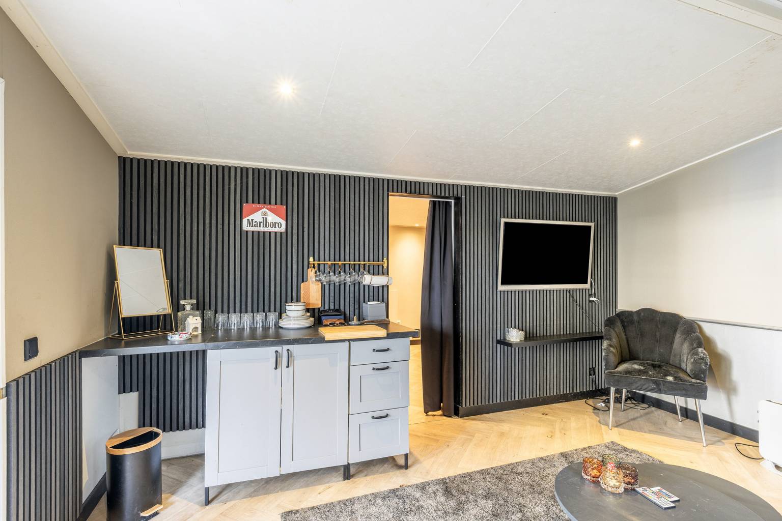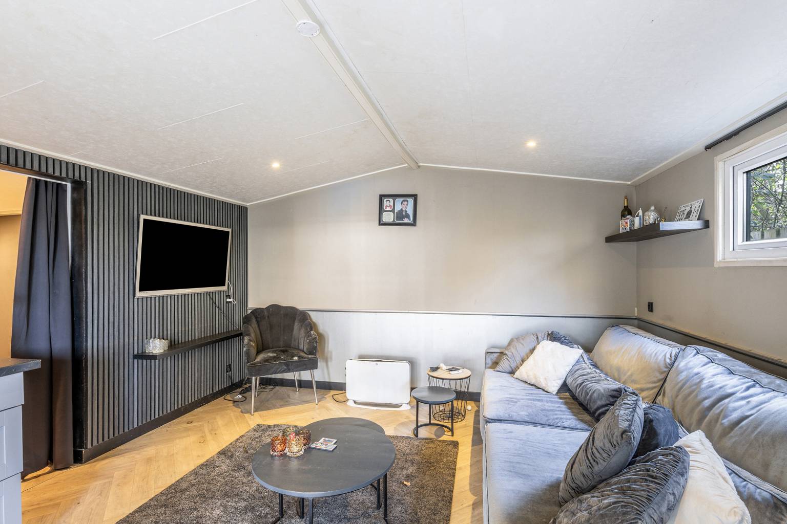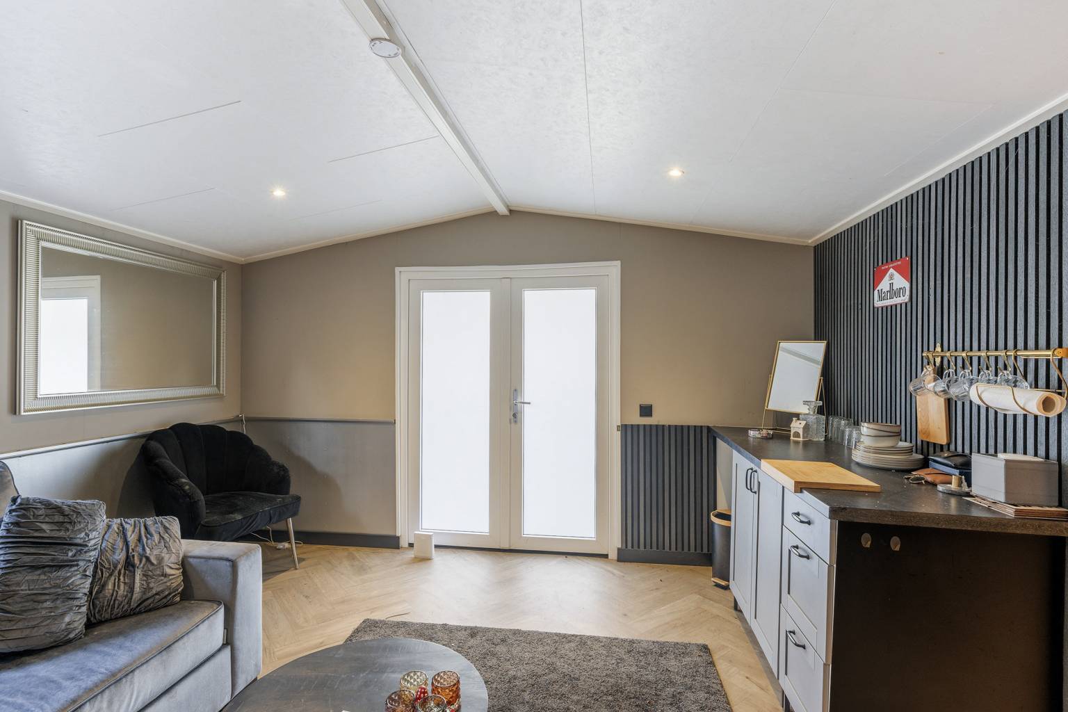 Het tuinhuis is ideaal voor inwonende kinderen of voor mantelzorg. Het beschikt namelijk over een woonkamer met een keukenblokje, een kamer met een vaste kast en een eigen toilet. Het geheel is afgewerkt met een visgraat laminaatvloer en inbouw spots in het plafond.
