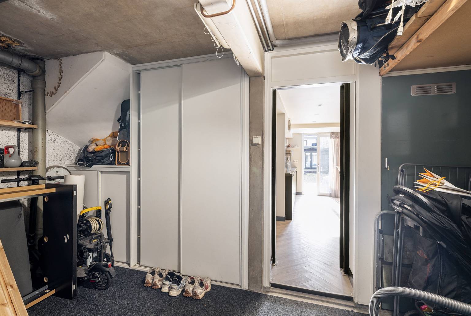 Via de smalle entreedeur is er toegang tot de garage, die eveneens is voorzien van een garagedeur. In de garage bevindt zich de meterkast en de aansluitingen voor de wasmachine en de droger. Er zijn vaste kasten met schuifdeuren en vanuit hier is er toegang tot de keuken. In de garage is verlichten en elektra aanwezig en op de vloer ligt tapijt.