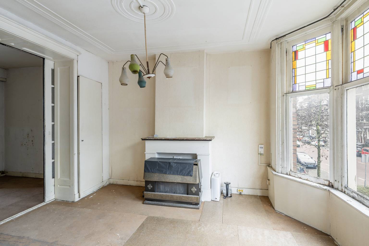 De woonkamer is gesitueerd aan de voorzijde, waarbij de bovenlichten in de erker en het aparte raam zijn voorzien van glas-in-lood. Het plafond is voorzien van een sierlijst met een ornament en de schouw is voorzien van een moederhaard. Er zijn verder twee vaste kasten aanwezig en de en-suite schuifdeuren geven toegang tot de tussenkamer.
