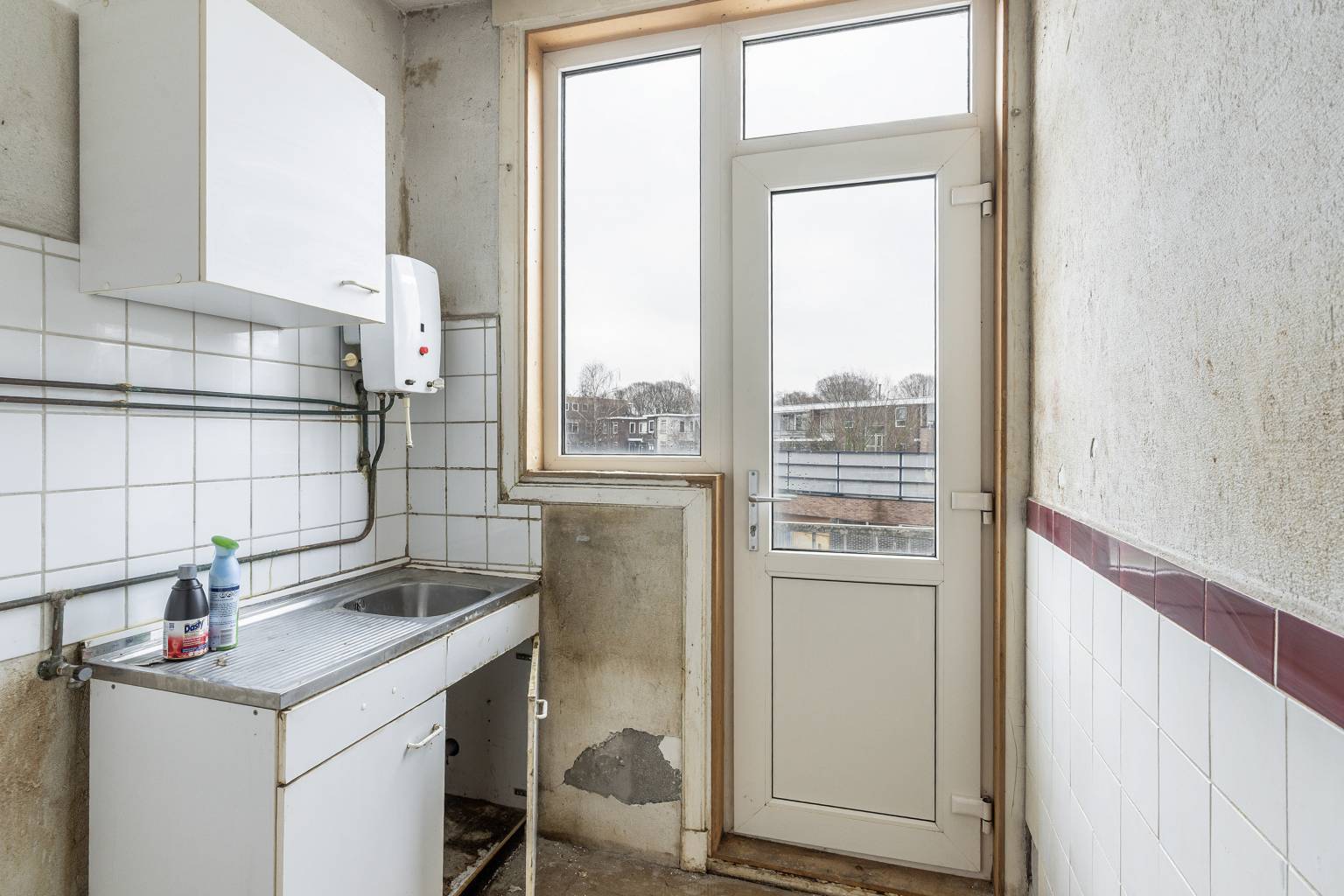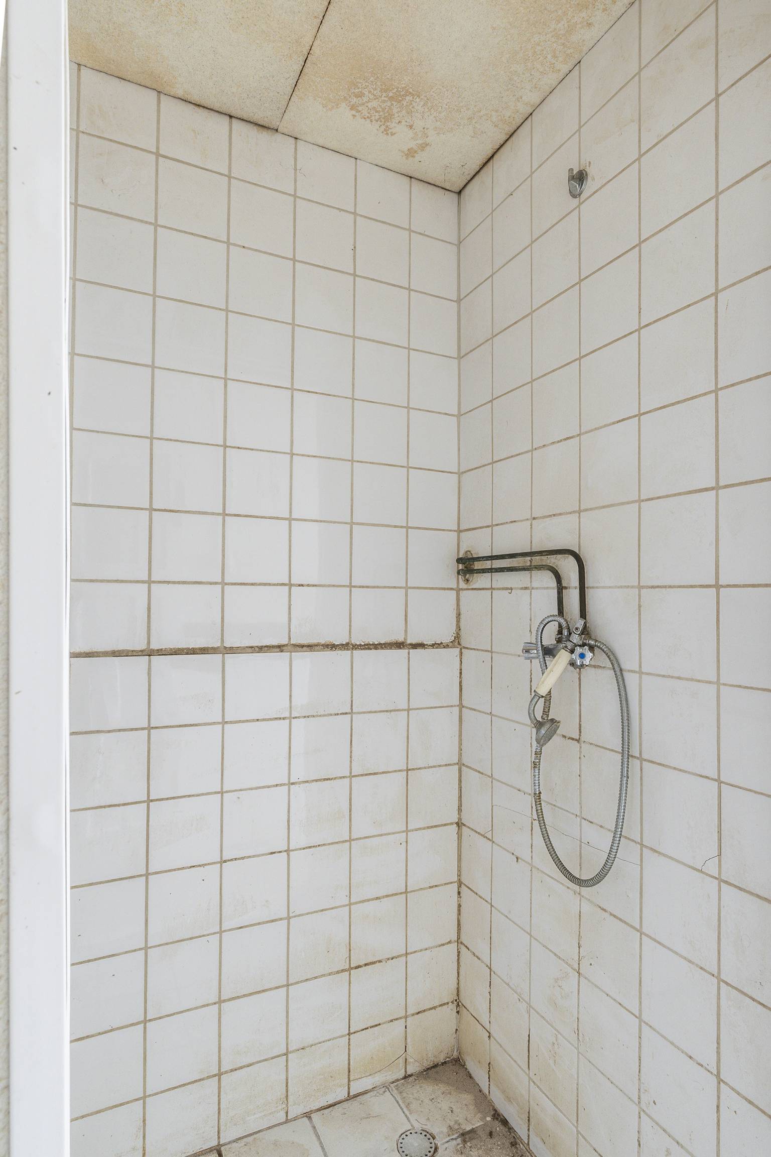 De keuken is opgedeeld en heeft een open toegang tot de douchehoek en beschikt over een recht keukenblokje met een bovenkast en een geiser. De wanden zijn hier gedeeltelijk betegeld en er is toegang tot het balkon aan de achterzijde.