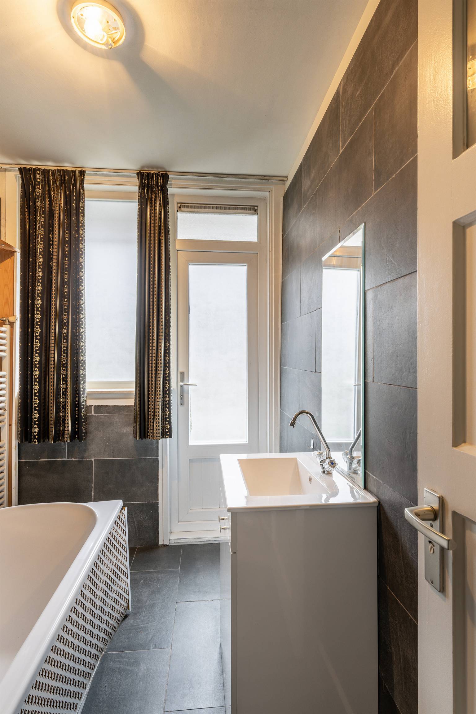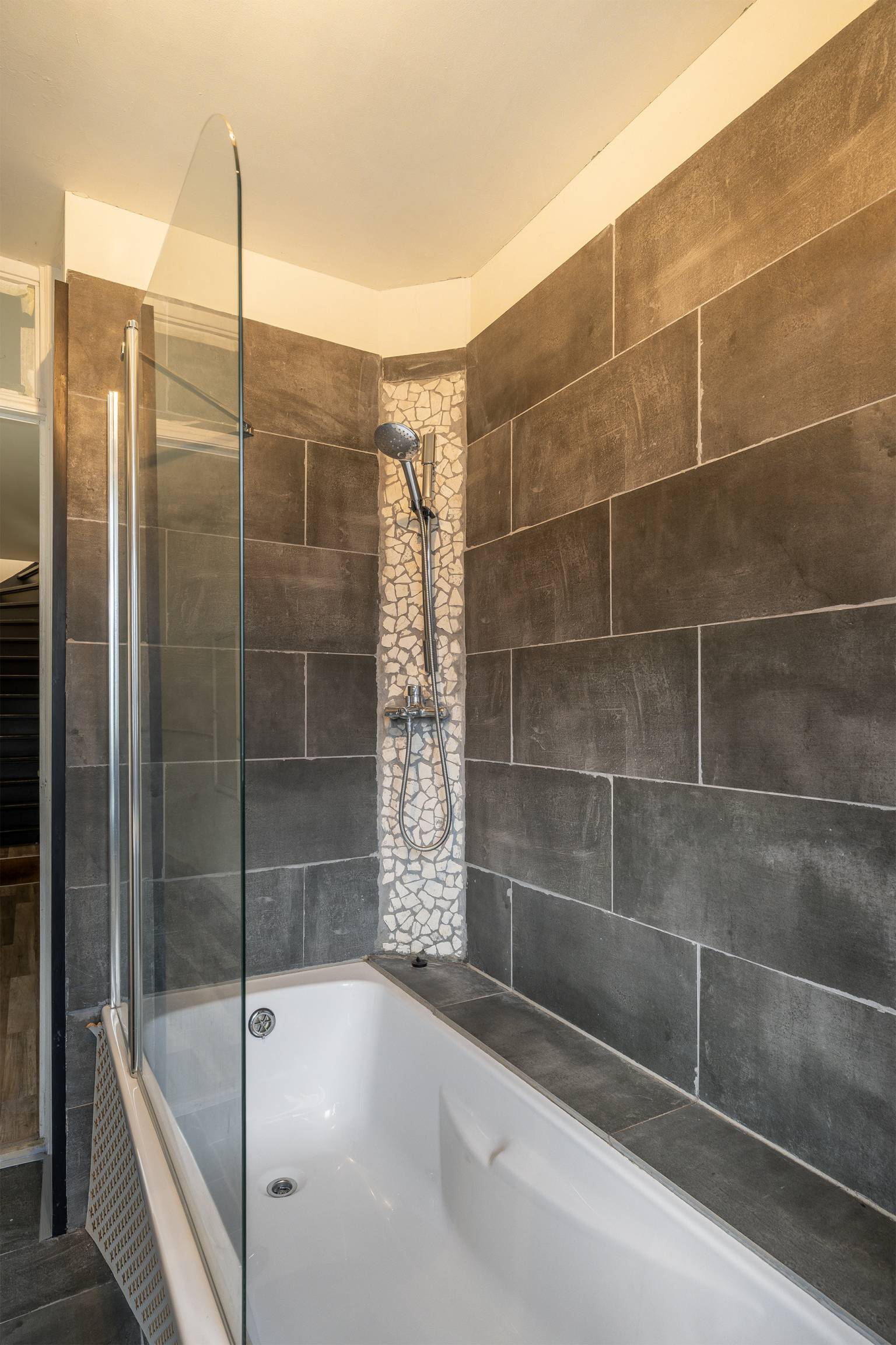 De grotendeels betegelde badkamer is uitgerust met een ligbad met een douche en een wastafelmeubel. Daarnaast hangt er ook een handdoeken radiator en is er een deur naar het balkon.