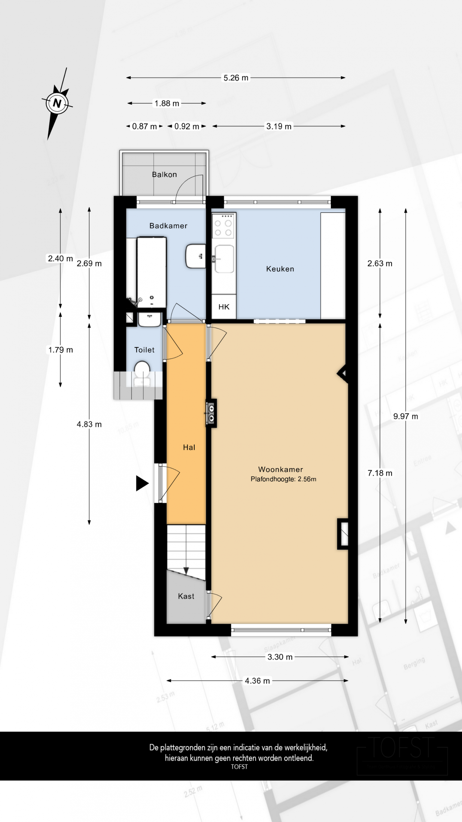 De Meetinstructie is gebaseerd op de NEN2580. De Meetinstructie is bedoeld om een meer eenduidige manier van meten toe te passen voor het geven van een indicatie van de gebruiksoppervlakte. De Meetinstructie sluit verschillen in meetuitkomsten niet volledig uit, door bijvoorbeeld interpretatieverschillen, afrondingen of beperkingen bij het uitvoeren van de meting. Indien de exacte maten voor een koper van cruciaal belang zijn, adviseren wij deze zelf na te meten. De (kandidaat)koper(s) zullen, indien gewenst, daartoe in de gelegenheid gesteld worden op een passend moment teneinde teleurstellingen en schade te voorkomen.