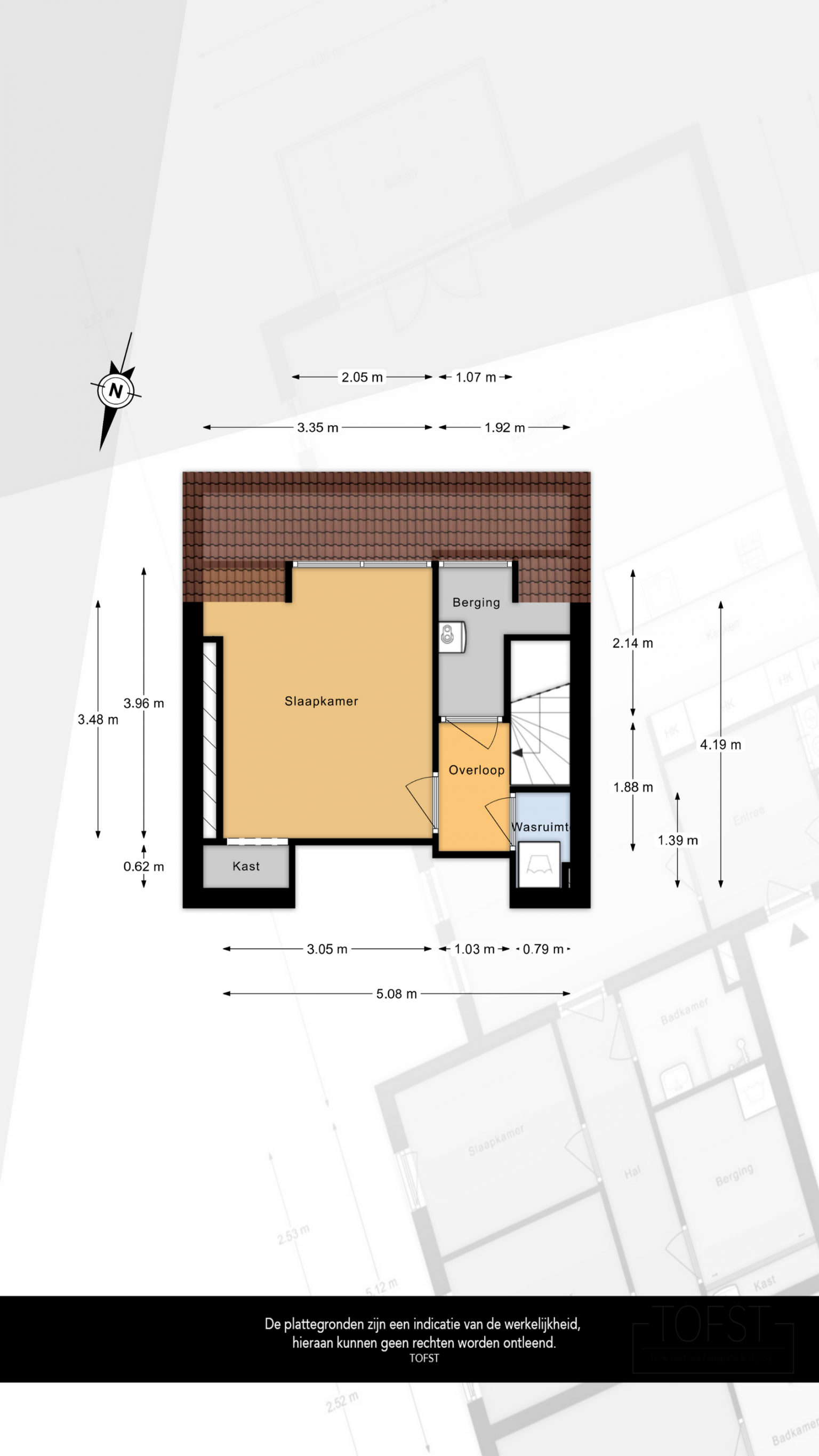 Na de trapopgang is er een bovenkomst op de overloop, die toegang geeft tot de slaapkamer, de berging en de gedeeltelijk betegelde wasruimte, met daarin de wasmachineaansluiting. Alle wanden zijn gesausd en de vloer is voorzien van laminaat.