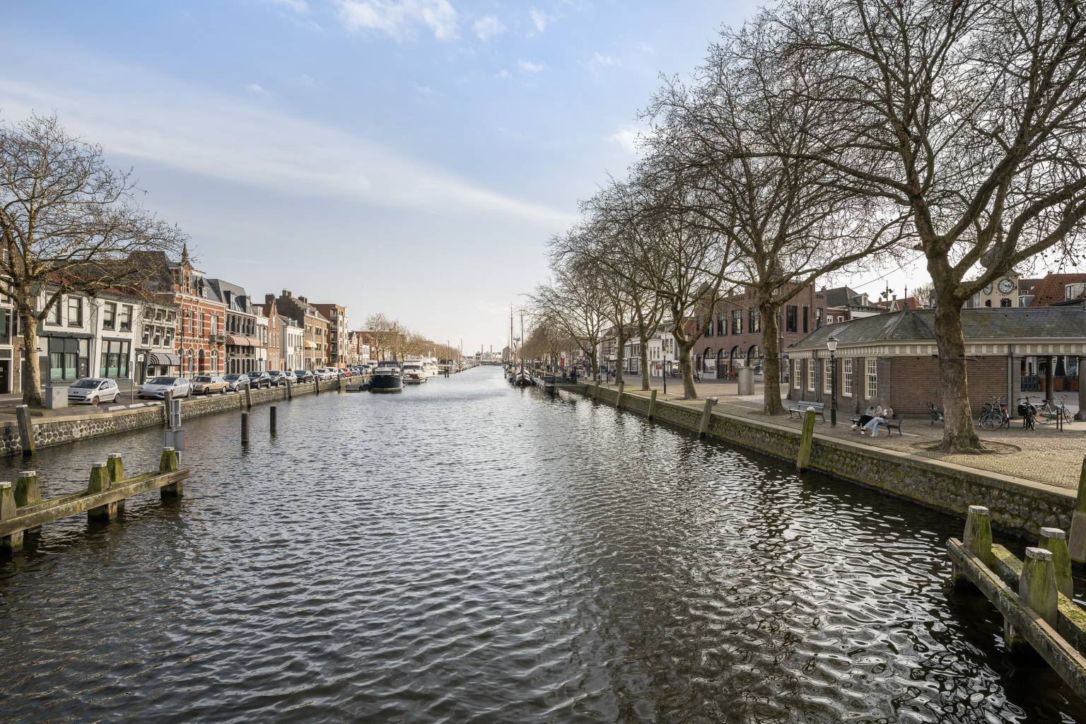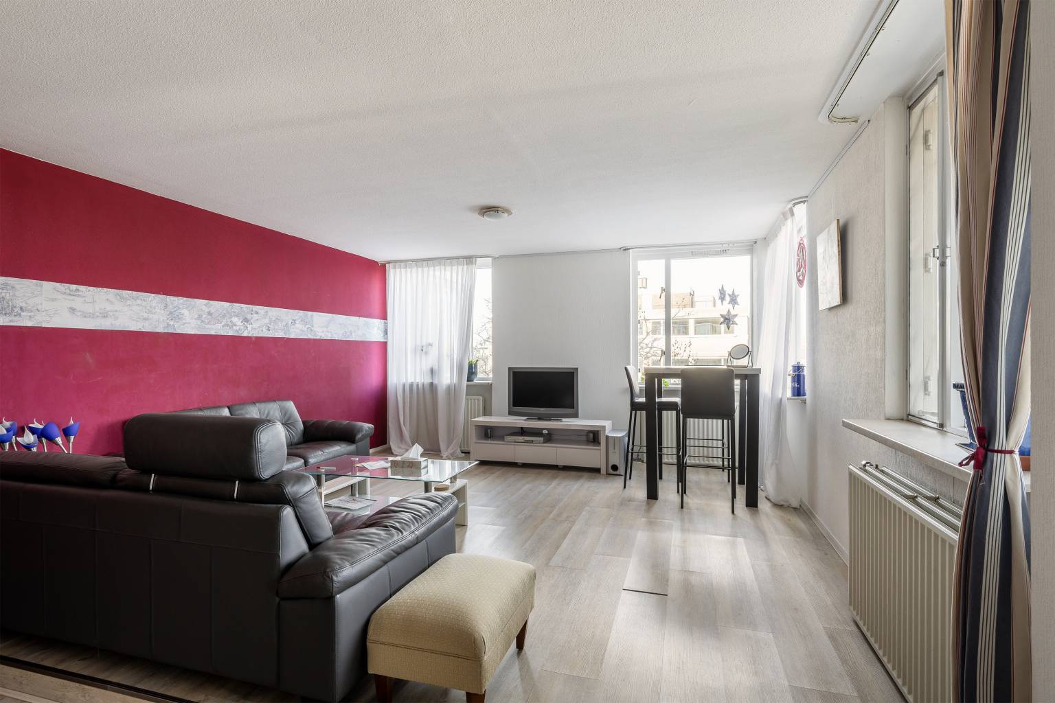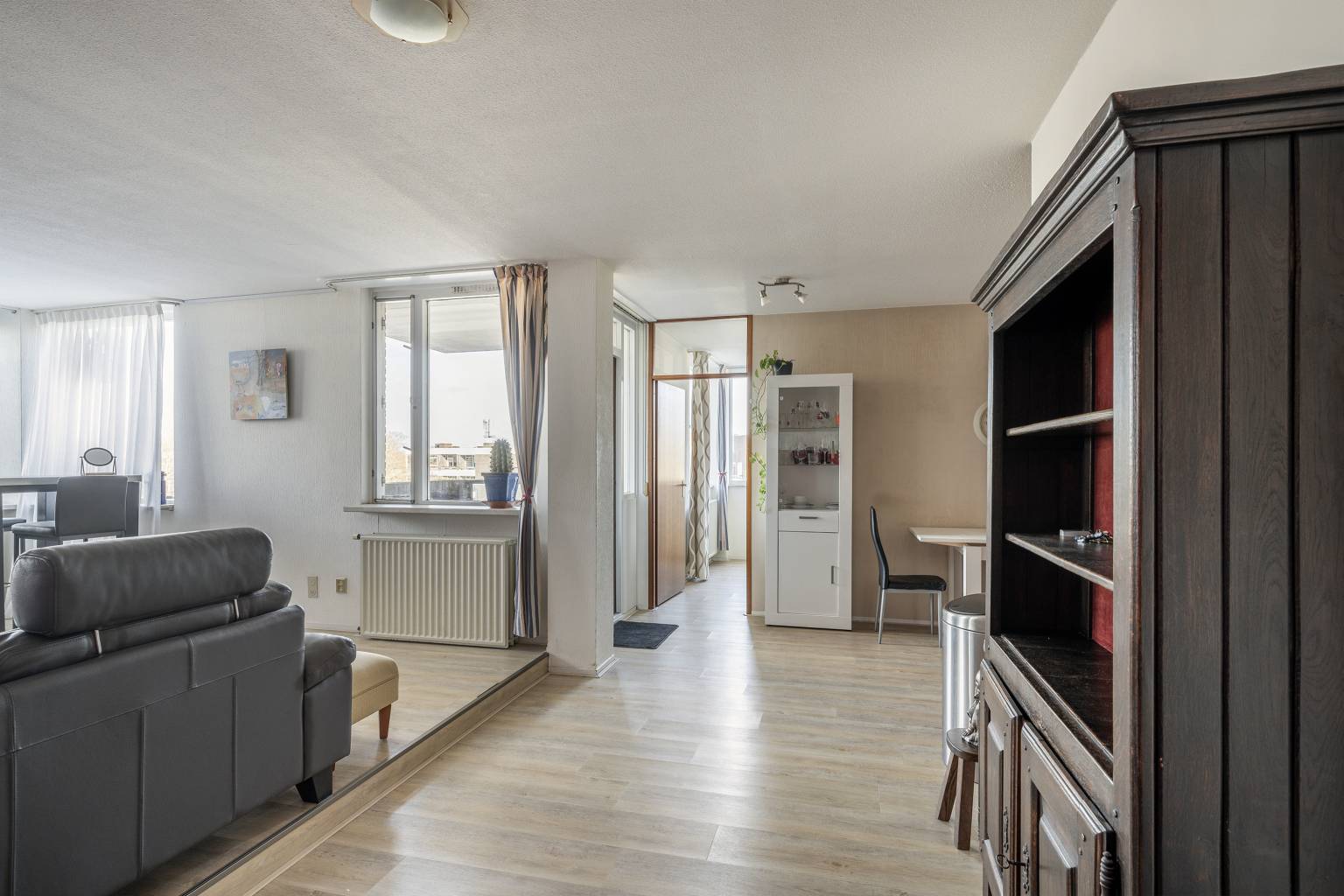 De woonkamer ligt iets verhoogd aan de voorzijde en is dankzij de vele ramen heerlijk licht. Hier staat het uitzicht centraal. Een levendig panorama over de haven en de stad. De open verbinding met de keuken zorgt voor een prettige indeling. De keuken is opgesteld in een hoek, voorzien van diverse apparatuur, een betegelde achterwand en zelfs ruimte voor een compacte eethoek. Vanuit de woonkamer bereik je het overdekte balkon met tegelvloer en stenen balustrade met glaspanelen, waar je beschut kunt genieten van het fraaie uitzicht. Er zijn twee slaapkamers, waarvan de eerste naast de badkamer ligt en voldoende ruimte biedt voor een tweepersoonsbed. De hoofdslaapkamer bevindt zich aan de voorzijde en kijkt eveneens uit over de haven. Naast een tweepersoonsbed is hier plek voor een garderobekast. De moderne, volledig betegelde badkamer is uitgerust met een inloopdouche, een wastafelmeubel met twee kranen, een handdoeken radiator en een spiegel. Kortom, een heerlijke plek voor wie comfortabel wil wonen midden in de stad, met het water als dagelijks decor.