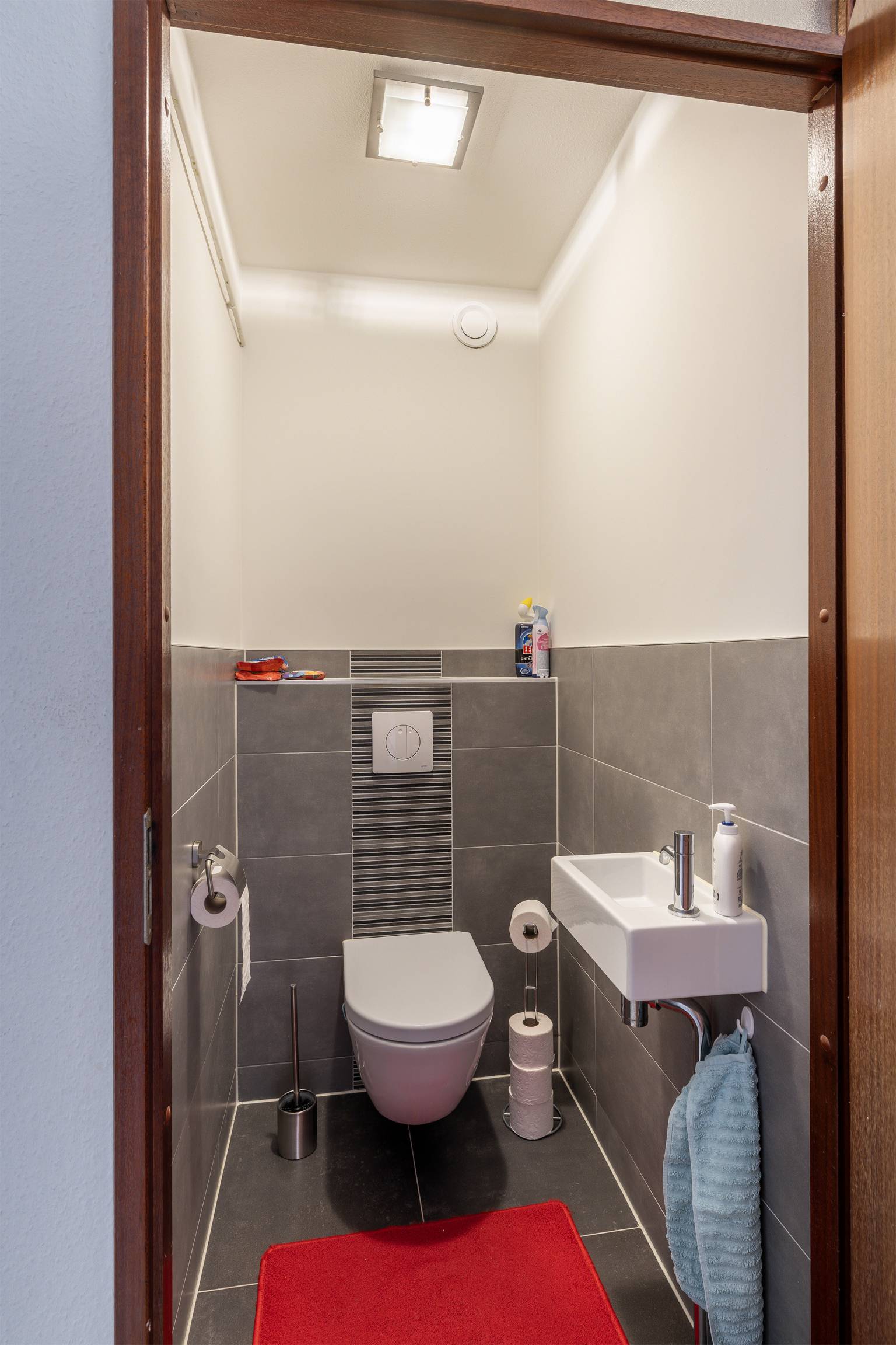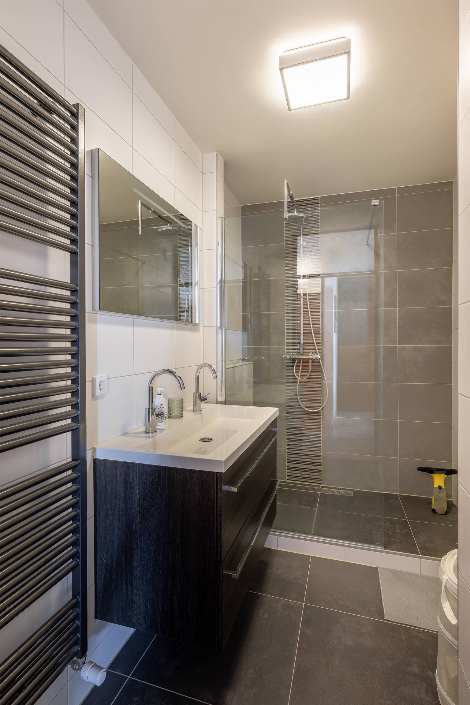 De moderne badkamer is volledig betegeld en uitgerust met een inloopdouche en een wastafelmeubel met twee kranen. Er is tevens een handdoeken radiator aanwezig en boven het wastafelmeubel hangt een spiegel.