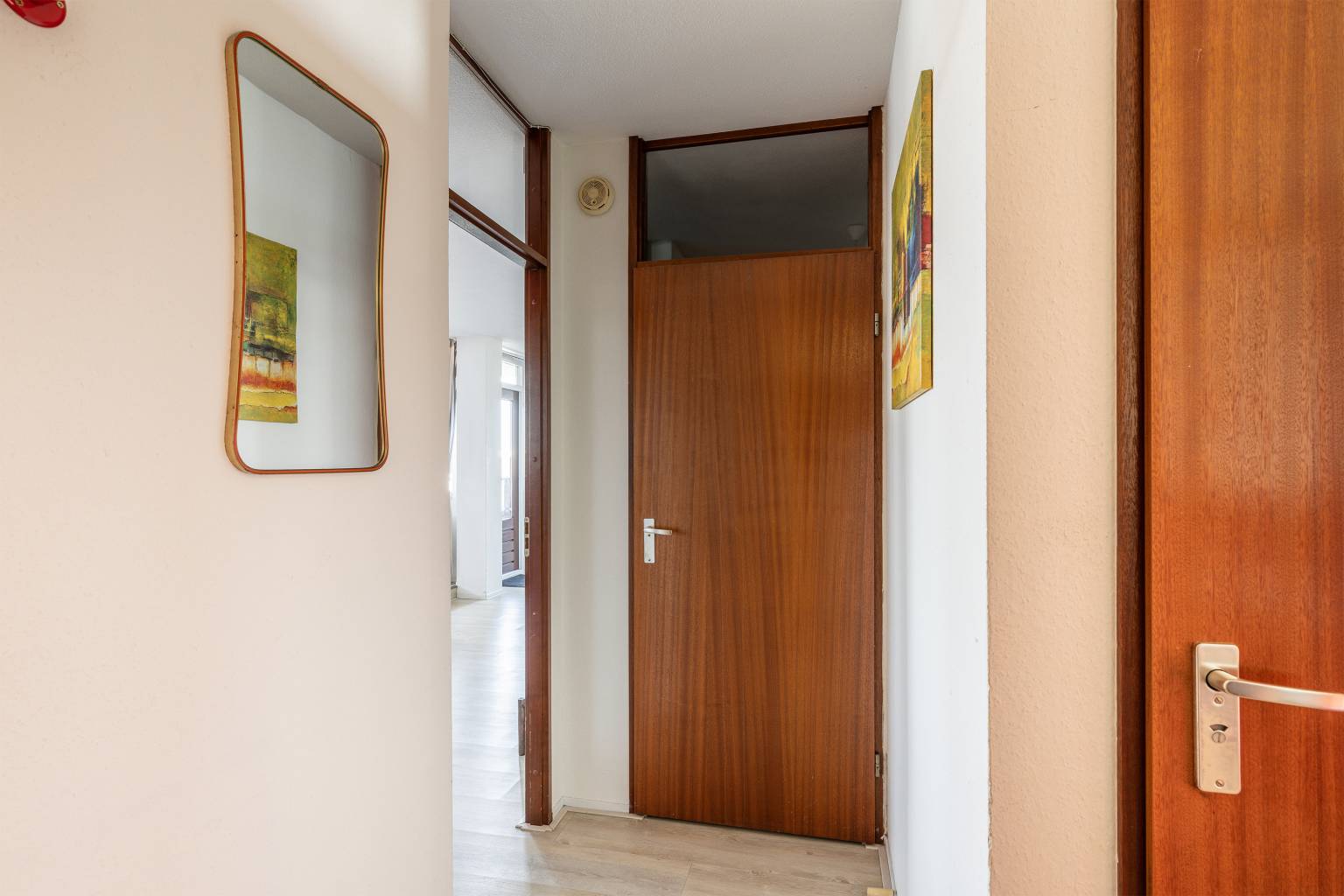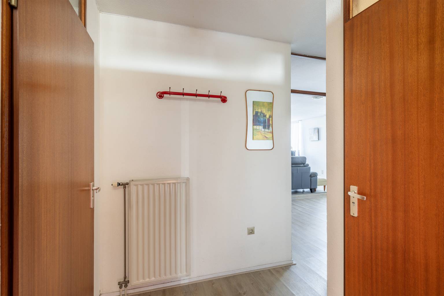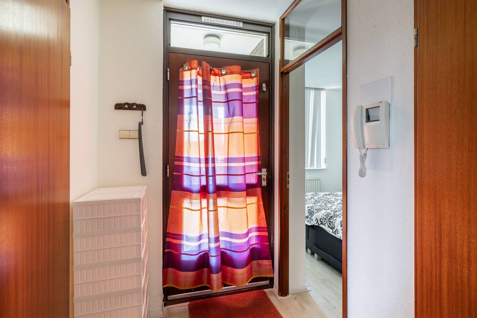 Na de voordeur is er een binnenkomst in de entreehal, die toegang geeft tot de woonkamer, de eerste slaapkamer, de badkamer, de inpandige berging met daarin de wasmachineaansluiting en het gedeeltelijk betegelde toilet. Alle wanden zijn gesausd en de vloeren zijn voorzien van laminaat.