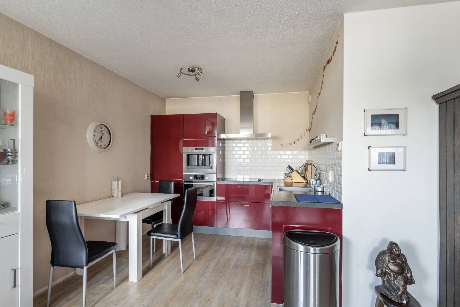 De keuken is opgesteld in een hoek met een betegelde achterwand. Er is diverse apparatuur aanwezig en in de keuken is zelfs ruimte voor een compacte eethoek.