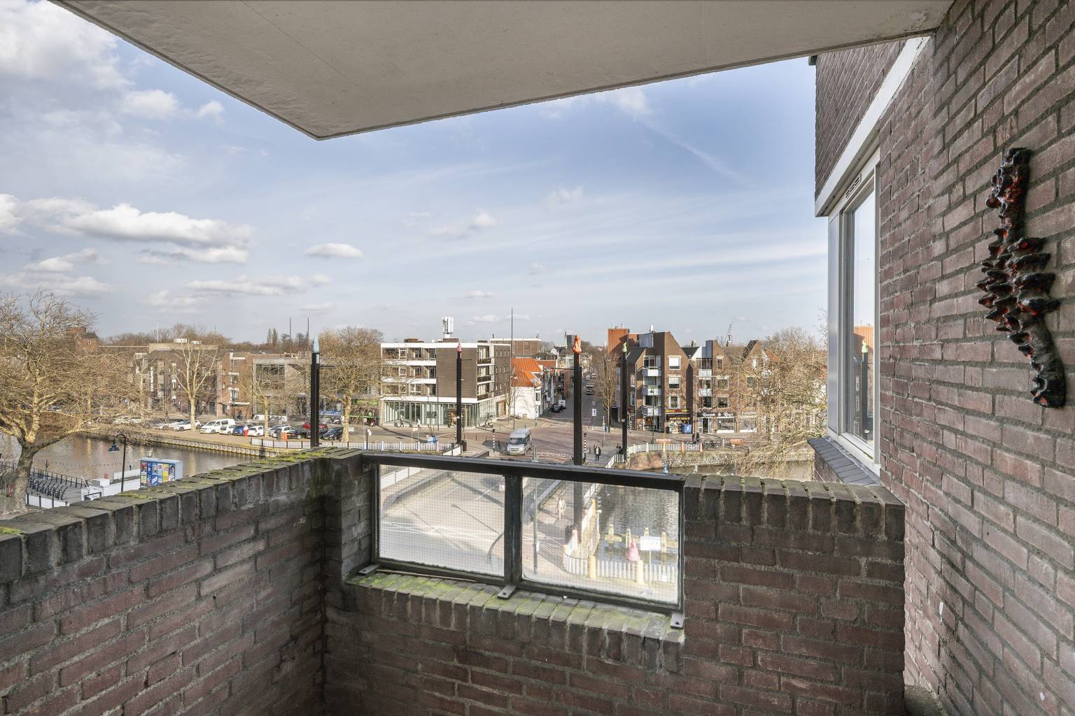 Het balkon is fijn overdekt en biedt net als de woonkamer een fraai uitzicht over de stad en de haven. De ondergrond is voorzien van tegels en de stenen balustrade is onderbroken met twee glaspanelen.