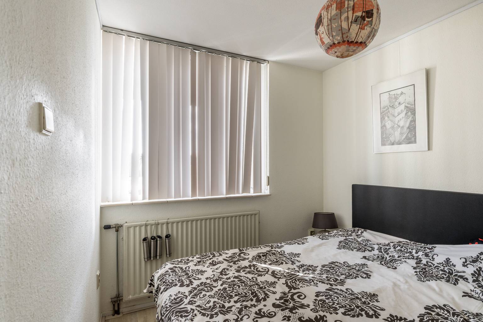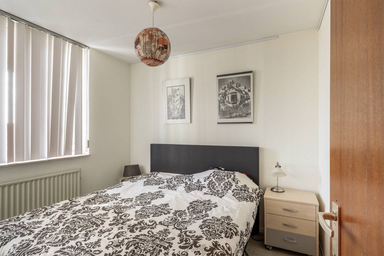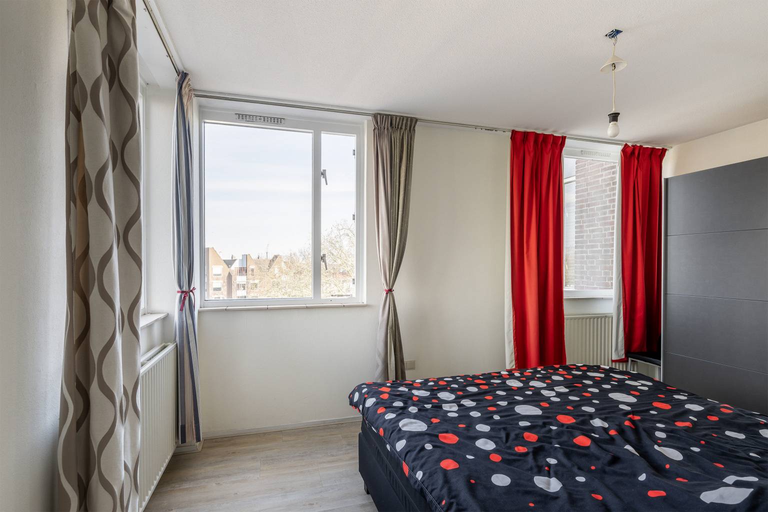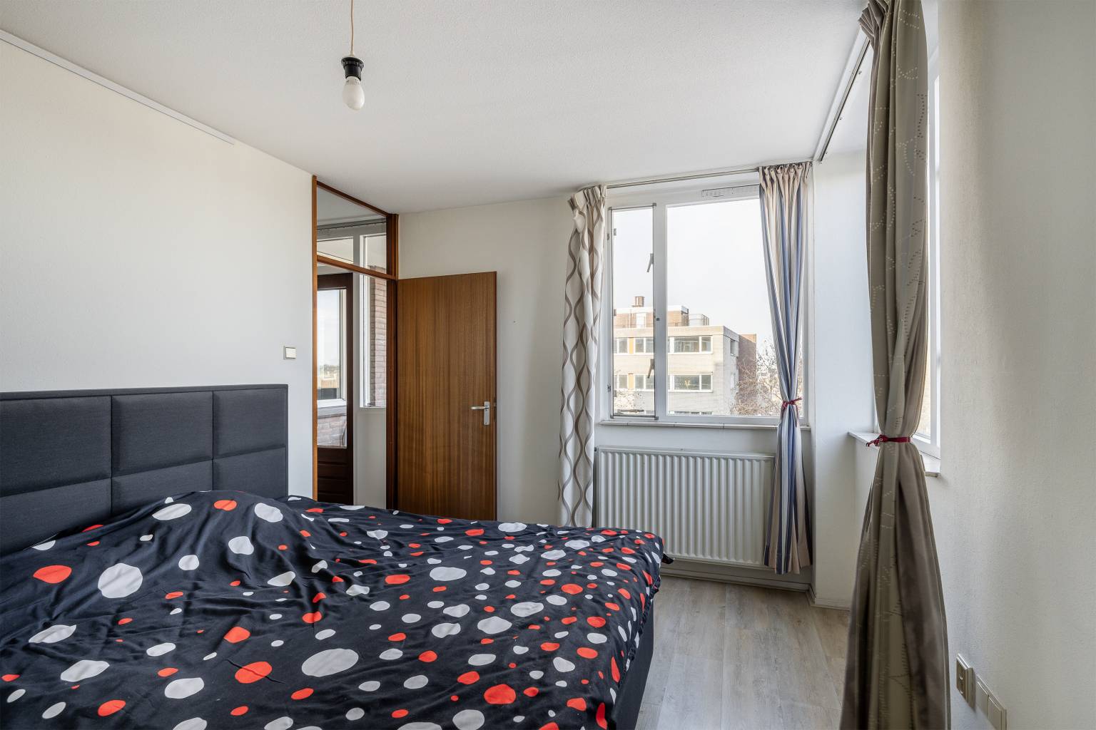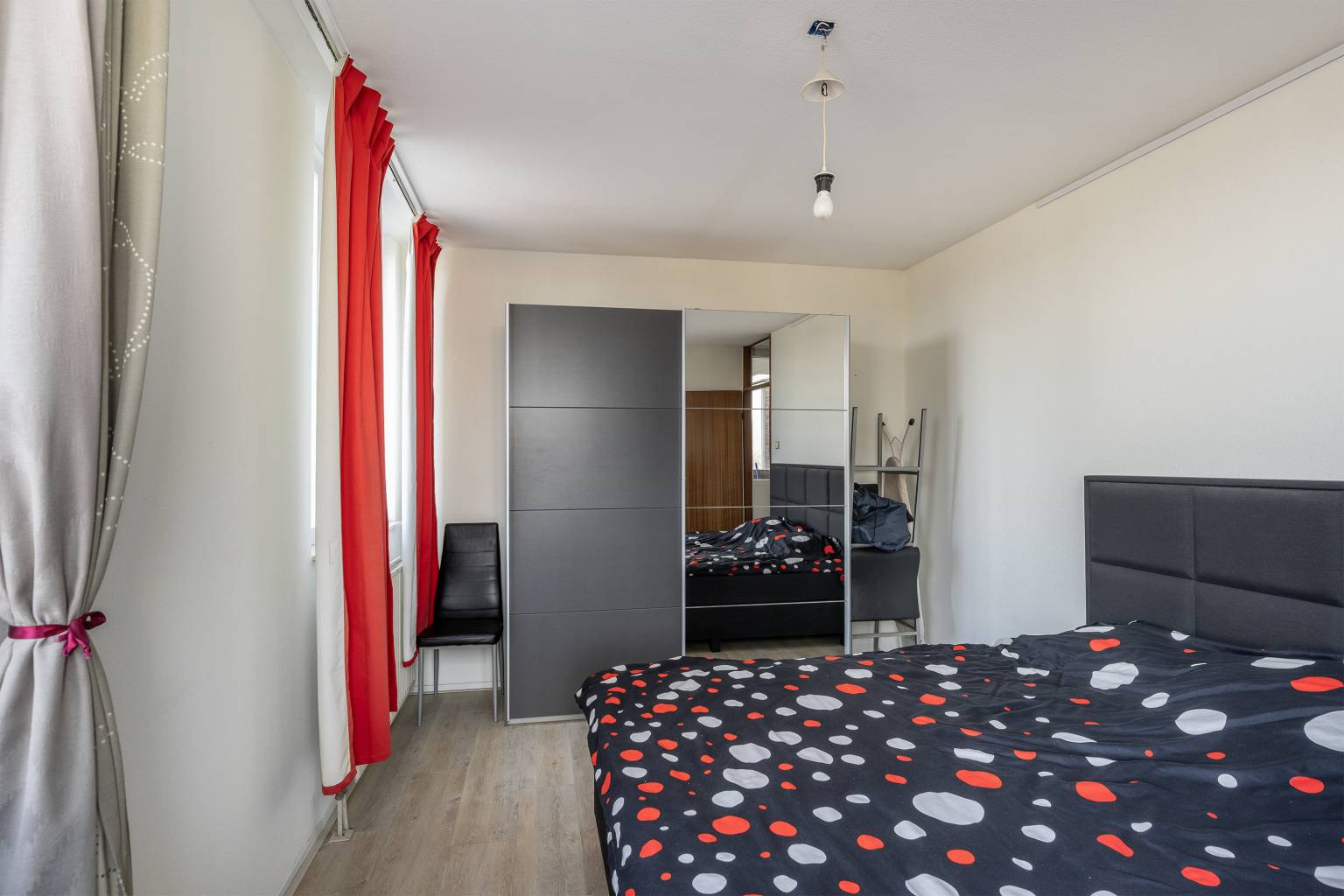 De eerste slaapkamer is gelegen naast de badkamer en biedt ruimte voor een tweepersoonsbed.